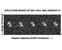 Pasadena CA (SPX) Jan 29, 2008 Scientists at NASA's Jet Propulsion Laboratory in Pasadena, Calif., have obtained the first images of asteroid 2007 TU24 using high-resolution radar data. The data indicate the asteroid is somewhat asymmetrical in shape, with a diameter roughly 250 meters (800 feet) in size. Asteroid 2007 TU24 will pass within 1.4 lunar distances, or 538,000 kilometers (334,000 miles), of Earth on Jan. 29 at 12:33 a.m. Pacific time (3:33 a.m. Eastern time). "With these first radar observations finished, we can guarantee that next week's 1.4-lunar-distance approach is the closest until at least the end of the next century," said Steve Ostro, JPL astronomer and principal investigator for the project. "It is also the asteroid's closest Earth approach for more than 2,000 years." Scientists at NASA's Near-Earth Object Program Office at JPL have determined that there is no possibility of an impact with Earth in the foreseeable future. Asteroid 2007 TU24 was discovered by the NASA-sponsored Catalina Sky Survey on Oct. 11, 2007. The first radar detection of the asteroid was acquired on Jan. 23 using the Goldstone 70-meter (230-foot) antenna. The Goldstone antenna is part of NASA's Deep Space Network Goldstone station in Southern California's Mojave Desert. Goldstone's 70-meter diameter (230-foot) antenna is capable of tracking a spacecraft traveling more than 16 billion kilometers (10 billion miles) from Earth. The surface of the 70-meter reflector must remain accurate within a fraction of the signal wavelength, meaning that the precision across the 3,850-square-meter (41,400-square-foot) surface is maintained within one centimeter (0.4 inch). Ostro and his team plan further radar observations of asteroid 2007 TU24 using the National Science Foundation's Arecibo Observatory in Puerto Rico on Jan. 27-28 and Feb. 1-4. The asteroid will reach an approximate apparent magnitude 10.3 on Jan. 29-30 before quickly becoming fainter as it moves farther from Earth. On that night, the asteroid will be observable in dark and clear skies through amateur telescopes with apertures of at least 7.6 centimeters (three inches). An object with a magnitude of 10.3 is about 50 times fainter than an object just visible to the naked eye in a clear, dark sky. Scientists working with Ostro on the project include Lance Benner and Jon Giorgini of JPL, Mike Nolan of the Arecibo Observatory, and Greg Black of the University of Virginia. NASA detects and tracks asteroids and comets passing close to Earth. The Near Earth Object Observation Program, commonly called "Spaceguard," discovers, characterizes and computes trajectories for these objects to determine if any could be potentially hazardous to our planet. The Arecibo Observatory is part of the National Astronomy and Ionosphere Center, a national research center operated by Cornell University, Ithaca, N.Y., for the National Science Foundation. JPL is a division of the California Institute of Technology in Pasadena. Community Email This Article Comment On This Article Related Links Near Earth Object Observation Program Asteroid and Comet Mission News, Science and Technology