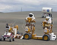 Washington DC (SPX) Jun 16, 2008 Conditions on the moon will be harsher, but prototype NASA robotic vehicles braved sand storms and unprecedented temperature swings this month on sand dunes near Moses Lake, Wash., to prepare for future lunar expeditions. Teams from seven NASA centers and several universities conducted the tests from June 2-13. "The goal was to gain hands-on experience with specific technical challenges anticipated when humans return to the moon by 2020, begin to explore the lunar surface, and set up outposts," said Test Director Bill Bluethmann of NASA's Johnson Space Center in Houston. NASA's Human Robotic Systems Project, part of the agency's Exploration Technology Development Program, focused on human and robotic mobility systems for the moon, but also looked at communication and command and control systems that will connect the explorers with Earth and each other. The Moses Lake dunes provided a wide variety of soil consistencies and terrain that allowed the team to put prototype scout robots, rovers, cargo carriers, cranes and spacesuits through tests in a harsh and changing environment. The prototype tests will be used to inform developers of specific requirements needed in lunar surface support systems for the Constellation Program. The program is building the launch vehicles and spacecraft that will take a new generation of explorers to the moon, as well as lunar landers, habitats, life support systems, vehicles and robots to support them. A ground control team located thousands of miles away at Johnson operated the robots and coordinated the movements of the suited explorers. NASA's Ames Research Center in Moffett Field, Calif., tested two K10 rovers that surveyed simulated lunar landing sites and built topographic and panoramic 3-D terrain models. One rover used a ground-penetrating radar to assess subsurface structures. The other used a 3-D scanning laser system known as LIDAR to create topographic maps. The scout robots are designed to perform highly repetitive and long-duration tasks, such as site mapping and science reconnaissance. "It's as close as we can get in a terrestrial environment to the lunar environment," said Brian Wilcox, principle investigator for the All-Terrain Hex-Legged Extra-Terrestrial Explorer robot, known as ATHLETE, at NASA's Jet Propulsion Laboratory in Pasadena, Calif. JPL tested two ATHLETE cargo-moving rovers. Each rover has six legs capable of rolling or walking over extremely rough or steep terrain. This will allow robotic or human missions on the surface of the moon to load, manipulate, deposit and transport payloads to desired sites. The team includes members from Johnson, Ames, Stanford University and The Boeing Co. Of Chicago. NASA's Glenn Research Center in Cleveland, and Carnegie Mellon University of Pittsburgh tested an autonomous drilling rover that could be used to search for valuable resources under the lunar surface in the moon's polar regions. The team also includes members from Ames, Johnson, NASA's Kennedy Space Center, the Canadian Space Agency and the Centre for Advanced Technology Inc. in Sudbury, Ontario. Engineers from Johnson tested a crew mobility chassis prototype, or lunar truck, and advanced spacesuit designs that could be used to greatly expand the exploration range of human explorers. NASA's new concept for a lunar truck was built in less than a year with unique features that allow each of its six wheels to move independently, giving the vehicle the ability to drive in any direction. Human drivers stood in turrets on the trucks that can pivot 360 degrees, contributing to easy steering. To practice soil-moving techniques for the moon, Kennedy developed a bulldozing blade for the lunar truck, named the Lunar Attachment Node for Construction Excavation, or LANCE. A lightweight, composite technology such as LANCE will be used on the moon to clear landing pads and protect outposts from dust and debris generated by arriving spacecraft. The tests will help NASA evaluate the feasibility of excavating lunar soil, or regolith, for landing pads, blast protection berms, pathways, foundations and lunar operations areas. NASA's Langley Research Center of Hampton, Va., demonstrated a lunar surface crane that could be used to lift and reposition heavy cargo, including modules used for crew quarters. The Lunar Surface Manipulator System is a lightweight lifting and precision positioning device that could give astronauts a helping hand during early outpost construction and follow-on operations. The crane can be operated autonomously, remotely or manually in backup mode, and can be reconfigured to perform different tasks. NASA's Goddard Space Flight Center of Greenbelt, Md., provided lunar payload mockups that were used with the lunar crane to demonstrate payload handling operations. Participants in the June tests will evaluate their data and prepare for additional tests in October at another site, yet to be announced, with moon-like conditions. Community Email This Article Comment On This Article Related Links Mars News and Information at MarsDaily.com Lunar Dreams and more