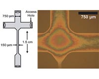 Gaithersburg MD (SPX) Jun 17, 2008 While the results may not rival the artistry of glassblowers in Europe and Latin America, researchers at the National Institute of Standards and Technology (NIST) and Cornell University have found beauty in a new fabrication technique called 'nanoglassblowing" that creates nanoscale (billionth of a meter) fluidic devices used to isolate and study single molecules in solution-including individual DNA strands. The novel method is described in a paper posted online next week in the journal Nanotechnology. Traditionally, glass micro- and nanofluidic devices are fabricated by etching tiny channels into a glass wafer with the same lithographic procedures used to manufacture circuit patterns on semiconductor computer chips. The planar (flat-edged) rectangular canals are topped with a glass cover that is annealed (heated until it bonds permanently) into place. About a year ago, the authors of the Nanotechnology paper observed that in some cases, the heat of the annealing furnace caused air trapped in the channel to expand the glass cover into a curved shape, much like glassblowers use heated air to add roundness to their work. The researchers looked for ways to exploit this phenomenon and learned that they could easily control the amount of 'blowing out" that occurred over several orders of magnitude. As a result, the researchers were able to create devices with 'funnels" many micrometers wide and about a micrometer deep that tapered down to nanochannels with depths as shallow as 7 nanometers-approximately 1,000 times smaller in diameter than a red blood cell. The nanoglassblown chambers soon showed distinct advantages over their planar predecessors. 'In the past, for example, it was difficult to get single strands of DNA into a nanofluidic device for study because DNA in solution balls up and tends to bounce off the sharp edges of planar channels with depths smaller than the ball," says Cornell's Elizabeth Strychalski. 'The gradually dwindling size of the funnel-shaped entrance to our channel stretches the DNA out as it flows in with less resistance, making it easier to assess the properties of the DNA," adds NIST's Samuel Stavis. Future nanoglassblown devices, the researchers say, could be fabricated to help sort DNA strands of different sizes or as part of a device to identify the base-pair components of single strands. Other potential applications of the technique include the manufacture of optofluidic elements-lenses or waveguides that could change how light is moved around a microchip-and rounded chambers in which single cells could be confined and held for culturing. This work was supported in part by Cornell's Nanobiotechnology Center, part of the National Science Foundation's Science and Technology Center Program. It was performed while Samuel Stavis held a National Research Council Research Associateship Award at NIST. Community Email This Article Comment On This Article Related Links National Institute of Standards and Technology Nano Technology News From SpaceMart.com Computer Chip Architecture, Technology and Manufacture
