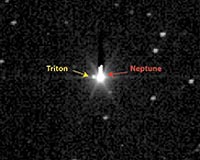 Baltimore MD (SPX) Mar 13, 2009 Add another moon to the New Horizons photo gallery: the spacecraft's Long Range Reconnaissance Imager detected Triton, the largest of Neptune's 13 known moons, during the annual spacecraft checkout last fall. New Horizons was 2.33 billion miles (3.75 billion kilometers) from Neptune on Oct. 16, when LORRI, following a programmed sequence of commands, locked onto the planet and snapped away. "We wanted to test LORRI's ability to measure a faint object near a much brighter one using a special tracking mode," says New Horizons Project Scientist Hal Weaver, of the Johns Hopkins University Applied Physics Laboratory, "and the Neptune-Triton pair perfectly fit the bill." LORRI was operated in 4-by-4 format (the original pixels are binned in groups of 16), and the spacecraft was put into a special tracking mode to allow for longer exposure times. "We needed to achieve the highest possible sensitivity," Weaver adds. Mission scientists also wanted to measure Triton itself. "Among the objects visited by spacecraft so far, Triton is by far the best analog of Pluto," says New Horizons Principal Investigator Alan Stern. The Voyager 2 spacecraft took spectacular images of Triton during its flyby of Neptune in 1989, showing evidence of cryovolcanic activity and cantaloupe-like terrain. Triton is only slightly larger than Pluto (1,700 miles [2,700 kilometers] in diameter compared to Pluto's 1,500 miles [2,400 kilometers]). Both objects have atmospheres primarily composed of nitrogen gas with a surface pressure only 1/70,000th of Earth's, and comparably cold surface temperatures (-390 degrees F on Triton and -370 degrees F on Pluto). Triton is widely believed to have once been a member of the Kuiper Belt (as Pluto still is) that was captured into orbit around Neptune, probably during a collision early in the solar system's history. New Horizons can observe Neptune and Triton at solar phase angles (the Sun-object-spacecraft angle) that are not possible to achieve from Earth-based facilities, and this unique perspective can provide insight into the properties of Titan's surface and Neptune's atmosphere. LORRI will continue to observe the Neptune-Triton pair during annual checkouts until the Pluto encounter in 2015. New Horizons is currently in electronic hibernation, 1.2 billion miles (1.93 billion kilometers) from home, speeding away from the Sun at 38,520 miles (61,991 kilometers) per hour. Share This Article With Planet Earth