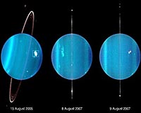 Berkeley CA (SPX) Aug 24, 2007As the rings of Uranus swing edge-on to Earth - a short-lived view we get only once every 42 years - astronomers observing the event are getting an unprecedented, glare-free view of the rings and the fine dust that permeates them. The rings were discovered in 1977, so this is the first opportunity astronomers have had to observe a Uranus ring crossing and perhaps to discover a new moon or two. |
