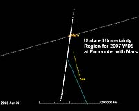 Pasadena CA (JPL) Jan 03, 2008 Additional position observations for asteroid 2007 WD5 taken on December 29 through January 2 have been used to improve the accuracy of the asteroid's orbit. As a result, the range of possible paths past Mars has narrowed by a factor of 3 and the most likely path has moved a little farther away from the planet, causing the Mars impact probability to decrease slightly to 3.6% (about one chance in 28). The new positional observations were made using the 2.4 meter telescope at New Mexico Tech's Magdalena Ridge Observatory and reported by astronomer Bill Ryan. It seems likely that as additional observations further shrink the uncertainty region of this asteroid, the region will no longer intersect Mars and the impact probability will quickly drop to zero. Community Email This Article Comment On This Article Related Links NASA/JPL Near-Earth Object Program Office Mars News and Information at MarsDaily.com Lunar Dreams and more