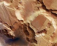 Paris, France (ESA) Dec 03, 2007 These images taken by the High-Resolution Stereo Camera (HRSC), onboard ESA's Mars Express imaged the Noctis Labyrinthus region, the 'labyrinth of the night' on Mars. The HRSC took these pictures on 25 June 2006 in orbit 3155, with a ground resolution of approximately 16 m/pixel. Noctis Labyrinthus lies at approximately 6.5 south and 260 east. The Sun illuminates the scene from the north-west, top right in the image above. The region is located directly on the western edge of Valles Marineris, the 'Grand Canyon' of Mars. The closely-spaced, deeply incised, smaller, labyrinth-like fractures are eye-catching. Noctis Labyrinthus forms part of a complex graben-system. This system formed due to extensional tectonics. During the process, intense volcanism in the Tharsis region led to the formation of a bulge, resulting in tectonic stress. This caused the crust to thin out and form graben structures, which are elongated, trench-like features bounded by parallel normal faults. As one can clearly see in the context map, the upper portion of the martian crust in this area is largely fractured. The scene in the picture exhibits parts of those graben structures that have 5000-m deep incisions. They are strongly eroded, and this can be seen from the debris at the bottom of the graben. Younger rock-formations can be seen on the upper-edge of the graben. The sharpened colour image has been derived from the three HRSC colour channels and the nadir channel. The perspective views have been calculated from the digital terrain model derived from the stereo channels. The anaglyph image was calculated from the nadir and one stereo channel. The black and white high-resolution image was derived from the nadir channel, which provides the highest level of detail. Community Email This Article Comment On This Article Related Links More images of Noctis Labyrinthus High-Resolution Stereo Camera (HRSC) Mars News and Information at MarsDaily.com Lunar Dreams and more
