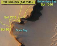 Pasadena CA (SPX) Oct 12, 2007 NASA's Mars Exploration Rover Opportunity finished the last step of a test in-and-out maneuver checking wheel slippage at the rim of Victoria Crater today. Then the rover immediately drove back into the crater as the start of a multi-week investigation on the big bowl's inner slope. Opportunity started the day with just two of its six wheels inside the rim of Victoria Crater and ended the day's driving about six meters (20 feet) inside the rim. The mission's first destination inside the crater is a light-toned layer of exposed rock that may preserve evidence of interaction between the Martian atmosphere and surface from millions of years ago. Victoria exposes a taller stack of ancient rock layers than any crater Opportunity has previously visited during the rover's nearly 44 months on Mars. The mission was originally planned for three months. "We want to maintain a safe egress route out of the crater for Opportunity, and by completing the back-up drive over the sand ripple at the rim, we have confirmed that we have one," said John Callas, Mars rover project manager at NASA's Jet Propulsion Laboratory, Pasadena, Calif. "Opportunity is now exploring the interior of Victoria Crater." Community Email This Article Comment On This Article Related Links Rover home page Mars News and Information at MarsDaily.com Lunar Dreams and more
