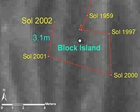 Pasadena CA (SPX) Sep 21, 2009 Opportunity completed the circumnavigation and full-circle imaging of the large meteorite "Block Island" and has resumed the long drive to Endeavour crater. On Sol 2001 (Sept. 9, 2009), the rover moved 9 meters (30 feet) around the meteorite to the fourth and fifth out of six planned positions. On the next sol Opportunity reached the sixth and final position around Block Island with a 3-meter (10-foot) bump. On Sol 2004 (Sept. 12, 2009), Opportunity departed Block Island and headed away with a 70-meter (230-foot) drive to the west. The westward direction is to head around a region of large dunes before turning south and east toward Endeavour. Two additional 70-meter (230-foot) westward drives were accomplished on sols 2006 and 2007 (Sept. 14 and 16, 2009; due to Mars sols being nearly 40 minutes longer than Earth days, no Opportunity sol number matched the criterion used here of noon at Opportunity's location falling on Sept. 15 in Los Angeles). As of Sol 2008 (Sept. 17, 2009), Opportunity's solar-array energy production is 499 watt-hours, with an atmospheric opacity (tau) of 0.565 and a dust factor improved to 0.582. Total odometry is 17,462.20 meters (10.85 miles). Share This Article With Planet Earth