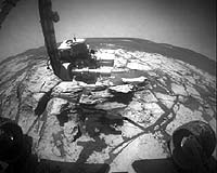 Pasadena CA (SPX) Jun 29, 2009 Opportunity has been moving toward a candidate patch of rock outcrop in preparation for a rest of the mobility system over the coming holiday. There continues to be concern with the elevated motor currents seen in the right front wheel. On Sol 1920 (June 18, 2009), Opportunity drove backwards about 63 meters (207 feet) south. The right front wheel currents were elevated but were not divergently increasing. After a few sols, Opportunity drove another 7 meters (23 feet) to a nearby outcrop. Robotic arm activities on surface targets with the microscopic image (MI) and the alpha particle X-ray spectrometer (APXS) were performed on Sols 1924 and 1925 (June 22 and 23, 2009). Further drives are planned to reach a large region of rock outcrop. Also, the week saw further implementation of the miniature thermal emission spectrometer (Mini-TES) mirror dust mitigation. The Mini-TES shroud is left open overnight to see if the environment will clean the elevation mirror. As of Sol 1924 (June 22, 2009), the solar array energy production was 450 watt-hours with an atmospheric opacity (tau) of 0.480 and a dust factor of 0.530, indicating that 53 percent of sunlight hitting the solar array penetrates the layer of accumulated dust on the array. As of Sol 1926 (June 24, 2009), Opportunity's total odometry remains at 16,639.71 meters (10.3 miles) Share This Article With Planet Earth