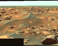 Pasadena CA (JPL) Sep 29, 2008 During the past week, Opportunity has been trying to reach a patch of dust between two crests of the ridge surrounding "Victoria Crater." The rover approached the ridge from the west, driving on flat ground, on Martian days, or sols, 1648 and 1650 (Sept. 12 and Sept. 14, 2008). Then, after reaching a staging position, Opportunity began to climb the ridge. That's when the rover's wheels began slipping excessively on the sandy slope. Rover drivers decided to give Opportunity another chance to make it up the slope by loosening the slip constraints. This allowed Opportunity to keep trying to climb the slope with a higher rate of wheel slippage. If the attempt to do this as planned on sol 1654 (Sept. 18, 2008) is not successful, rover drivers may try a different approach or abandon the effort. After the dust patch campaign, plans call for Opportunity to drive south toward a 20-kilometer-wide (12-mile-wide) crater 12 kilometers (7.5 miles) away. Opportunity is healthy, and all subsystems are performing as expected. Based on the latest data from sol 1653 (Sept. 17, 2008), the rover has 582 watt-hours of solar power available each day. (One hundred watt-hours is the amount of energy needed to light a 100-watt bulb for one hour.) In addition to measuring dust-related changes in atmospheric clarity each day with the panoramic camera, Opportunity completed the following activities: Sol 1648 (Sept. 12, 2008): Opportunity stowed the robotic arm and began driving toward the dust patch. Just before and after ending the drive, Opportunity took images with the hazard-avoidance and navigation cameras, respectively. The rover acquired a 4-by-1 panel of images, called the "Bagnold mosaic," with the panoramic camera. Sol 1649: Opportunity took full-color images, using all 13 filters of the panoramic camera, of a target nicknamed "Drummond." After relaying data to NASA's Odyssey orbiter for transmission to Earth, Opportunity measured argon gas in the Martian atmosphere with the alpha-particle X-ray spectrometer. Sol 1650: In the morning, Opportunity took thumbnail images of the sky with the panoramic camera. The rover continued driving toward the dust patch and documented progress before and after ending the drive by taking images with the engineering cameras. Opportunity acquired another 4-by-1 panel of images for the Bagnold mosaic before sending data to Odyssey. Sol 1651: Opportunity searched for morning clouds in the Martian sky by taking six time-lapse, movie frames with the navigation camera. The rover took spot images of the sky for calibration purposes, surveyed the horizon, and surveyed the sky at low Sun with the panoramic camera. Sol 1652: In the morning, Opportunity searched for clouds passing overhead by taking six time-lapse, movie frames with the navigation camera. The rover checked for drift -- changes with time -- in the miniature thermal emission spectrometer and also conducted a test of the instrument. Before beginning the day's drive, Opportunity used the spectrometer to study a target dubbed "Velvet" and survey the sky and ground at different elevations. The rover then attempted to drive up the ridge to the dust patch, acquiring images along the way with the hazard-avoidance and navigation cameras. Opportunity sent data to Odyssey for transmission to Earth. Sol 1653: Opportunity acquired a 3-by-1 mosaic of westward-looking images with the navigation camera and took images in total darkness with the panoramic camera for calibration purposes. Sol 1654 (Sept. 18, 2008): Upon rising, Opportunity took more "dark current" images with the panoramic camera for calibration purposes. The rover tried once more to drive to the dust patch, taking images before and after ending the drive with the hazard-avoidance and navigation cameras. Before proceeding with plans to measure atmospheric argon, Opportunity transmitted data to Odyssey for relay to Earth. Odometry: As of sol 1653 (Sept. 17, 2008), Opportunity's total odometry was 11,796.22 meters (7.33 miles). Community Email This Article Comment On This Article Related Links Mars Rovers at JPL Mars Rovers at Cornell Mars News and Information at MarsDaily.com Lunar Dreams and more