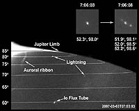 Chicago (AFP) Oct 9, 2007 Images from a NASA probe have shown that lightning does occur at the poles on Jupiter, a phenomenon previously only seen on Earth, a study released Tuesday said. Lightning strikes had previously been observed at lower latitudes and around the equator on the gas planet but the jagged bolts of electricity had never been observed at either of its two poles, puzzling astronomers. But as it rocketed past Jupiter on its way to Pluto in March this year, NASA's New Horizons spacecraft snapped hundreds of images of the Jupiter system, yielding dazzling new data and previously unseen glimpses of the planet. Images taken by the probe's Long Range Reconnaisance Imager revealed six flashes of light in the north polar region and seven in the south. The most polarward strikes were at 80 degrees north and 74 degrees south. Some of the bolts were ten times as powerful as anything ever recorded on Earth. "This validates what we have thought for 20 years. Jupiter is behaving like it should," said Kevin Baines, a planetary scientist at NASA's Jet Propulsion Laboratory in Pasadena, California, and lead author of the paper. A giant ball of gas and liquid, Jupiter radiates about twice as much heat into space as it receives from the sun. Based on the laws of physics, the planet should radiate heat uniformly which should produce lightning strikes uniformly as the heat moves through water clouds. New Horizons was the eighth spacecraft to visit Jupiter but a combination of trajectory, timing and technology allowed it to explore details no probe had seen before. The images provided evidence on the life cycle of fresh ammonia clouds, boulder-size clumps speeding through the planet's faint rings and the structure inside volcanic eruptions on its moon Io. The New Horizons probe -- the fastest spacecraft ever launched -- blasted off from Cape Canaveral, Florida in January 2006 and is expected to reach Pluto and its moons by 2015. The paper appears in the journal Science. Community Email This Article Comment On This Article Related Links Jupiter and its Moons Explore The Ring World of Saturn and her moons The million outer planets of a star called Sol News Flash at Mercury