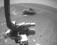 Pasadena CA (JPL) Aug 05, 2009 The Opportunity rover has eyed an odd-shaped, dark rock, about 0.6 meters (2 feet) across on the surface of Mars, which may be a meteorite. The team spotted the rock called "Block Island," on July 18, 2009, in the opposite direction from which it was driving. The rover then backtracked some 250 meters (820 feet) to study it closer. Scientists will be testing the rock with the alpha particle X-ray spectrometer to get composition measurements and to confirm if indeed it is a meteorite. Share This Article With Planet Earth