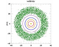 Boulder CO (SPX) Jul 16, 2009 Many of the objects found today in the asteroid belt located between the orbits of Mars and Jupiter may have formed in the outermost reaches of the solar system, according to an international team of astronomers led by scientists from Southwest Research Institute (SwRI). The team used numerical simulations to show that some comet-like objects residing in a disk outside the original orbit of the planets were scattered across the solar system and into the outer asteroid belt during a violent phase of planetary evolution. Usually, the solar system is considered a place of relative permanence, with changes occurring gradually over hundreds of millions to billions of years. New models of planet formation indicate, however, that at specific times, the architecture of the solar system experienced dramatic upheaval. In particular, it now seems probable that approximately 3.9 billion years ago, the giant planets of our solar system - Jupiter, Saturn, Uranus and Neptune - rearranged themselves in a tumultuous spasm. "This last major event of planet formation appears to have affected nearly every nook and cranny of the solar system," says lead author Dr. Hal Levison of SwRI. Key evidence for this event was first identified in the samples returned from the Moon by the Apollo astronauts. They tell us about an ancient cataclysmic bombardment where large asteroids and comets rained down on the Moon. Scientists now recognize that this event was not limited solely to the Moon; it also affected the Earth and many other solar system bodies. "The existence of life on Earth, as well as the conditions that made our world habitable for us, are strongly linked to what happened at this distant time," states Dr. David Nesvorny of SwRI. The same dynamical conditions that devastated the planets also led to the capture of some would-be impactors in the asteroid belt. "In the classic movie 'Casablanca,' everybody comes to Rick's. Apparently throughout the solar system, the cool hangout for small objects is the asteroid belt," says Dr. William Bottke of SwRI. Once in the asteroid belt, the embedded comet-like objects began to beat up both themselves and the asteroids. "Our model shows that comets are relatively easy to break up when hit by something, at least when compared to typical asteroids. It is unavoidable that some of the debris went on to land on asteroids, the Moon and the Earth. In fact, some of the leftovers may still be arriving today," says Dr. Alessandro Morbidelli of the Observatoire de la Cote d'Azur in Nice, France.The team believes the surprising similarities between some micrometeorites landing on Earth and comet samples returned by NASA's Stardust mission are no accident. "There has been lots of debate about the nature of micrometeorites reaching the Earth," says Dr. Matthieu Gounelle of the Museum National d'Histoire Naturelle in Paris. "Some believe they are asteroidal, while others argue they are cometary. Our work suggests that in a sense, both camps may be right." "Some of the meteorites that once resided in the asteroid belt show signs they were hit by 3.5 to 3.9 billion years ago. Our model allows us to make the case they were hit by captured comets or perhaps their fragments," adds Dr. Kleomenis Tsiganis of Aristotle University of Thessaloniki, Greece. "If so, they are telling us the same intriguing story as the lunar samples, namely that the solar system apparently went berserk and reconfigured itself about 4 billion years ago. " Overall, the main asteroid belt contains a surprising diversity of objects ranging from primitive ice/rock mixtures to igneous rocks. The standard model used to explain this assumes that most asteroids formed in place from a primordial disk that experienced radical chemical changes within this zone. This model shows, however, that the observed diversity of the asteroid belt is not a direct reflection of the intrinsic compositional variation of the proto-planetary disk. These results fundamentally change our view of the asteroid belt. Additional tests of this model will come from studies of meteorites, the asteroid belt, planet formation and the Moon. "The Moon and the asteroid belt may be the best and most accessible places in the solar system to understand this critical part of solar system history," says Levison. "We believe key evidence from these cold airless bodies may help us unlock the biggest 'cold case' of all time." The article, "The Contamination of the Asteroid Belt by Primordial Trans-Neptunian Objects," by Hal Levison, William Bottke, Alessandro Morbidelli, Matthieu Gounelle, David Nesvorny and Kleomenis Tsiganis, was published in the July 16 issue of Nature. Share This Article With Planet Earth