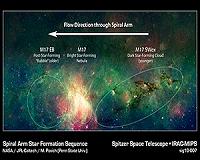 Newborn Stars Discovered In Dark Cosmic CloudUniversity Park PA (SPX) Jul 08, 2010 A wave of massive star formation appears poised to begin within a mysterious, dark cloud in the Milky Way. NASA's Spitzer Space Telescope has revealed a secluded birthplace for stars within a wispy, dark cloud named named M17 SWex. The dark cloud is part of the larger, parent nebula known as M17, a vast region of our galaxy with a bright, central star cluster. "We believe we've managed to ... read more |