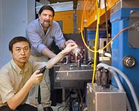 Upton NY (SPX) Jul 27, 2007 Researchers at the U.S. Department of Energy's Brookhaven National Laboratory have generated extremely short pulses of light that are the strongest of their type ever produced and could prove invaluable in probing the ultra-fast motion of atoms and electrons. The scientists also made the first observations of a phenomenon called cross-phase modulation with this high-intensity light - a characteristic that could be used in numerous new light source technologies. The work, which was done at Brookhaven's Source Development Laboratory, an offshoot of the Lab's National Synchrotron Light Source (NSLS), is described online in the July 23, 2007, edition of Physical Review Letters. The light pulses used were in the terahertz (THz) range of the broad electromagnetic spectrum, found between the microwave and infrared range. Scientists send tight bunches of electrons at nearly the speed of light through a magnetic field to produce THz radiation at a trillion cycles per second - the terahertz frequency that gives the light its name and that makes them especially valuable for investigating biological molecules and imaging, ranging from tumor detection to homeland security. The Brookhaven team is looking to expand the potential uses for this type of light by increasing the strength of individual THz pulses, a longtime goal for scientists in the field. By slamming an electron beam from an accelerator into an aluminum mirror, the researchers produced 100 microjoule (100 megawatt) single-cycle pulses - the highest energy ever achieved to date with THz radiation. For comparison, 100 megawatts is about the output of a utility company's electrical generator. The combination of this newfound strength with ultra-fast pulses provides researchers with a powerful new tool to study the movement of a material's electrons (which zip around at the femtosecond, or quadrillionth of a second, timescale) or atoms (which move at the picosecond, or trillionth of a second, timescale). "The goal is really to understand the properties of materials," said NSLS researcher Yuzhen Shen, the lead author of the paper. "One might ask what happens in a solid when light, electricity, or sound goes through it, and it's all related to atoms in a crystal wiggling around or the movement of electrons. So the effort surrounding ultra-fast pulses is going into making tools to probe the real fundamental properties of materials on the scales at which they move." Using this strong light, researchers can "kick" molecular processes such as catalysis or electronic switching (important for developing data storage media) into action and watch their mechanisms on a very short timescale. The team also found something surprising: the intensity of their THz pulses is so great that they introduce so-called "nonlinear optical effects," specifically, a phenomenon known as cross-phase modulation. "When you pull on a spring, if you pull twice as hard, it stretches twice as much," said NSLS researcher Larry Carr. "But there's a limit where if you pull twice as hard, the spring doesn't move anymore. That's when it's called nonlinear. The same thing happens in materials. You let these short pulses pass through a material, and they stress it and pull some of the charges apart so they don't act in a linear manner." As a result, the researchers can manipulate both the ultra-fast THz pulses and the material they interact with. Some of the simplest examples include changing the color of the light or turning the material into a focusing lens. This is the first time cross-phase modulation has been observed in single-cycle THz pulses. Learning how to control this characteristic could lead to even more light source technologies. This research was supported by the Office of Basic Energy Sciences within the U.S. Department of Energy's Office of Science, the Office of Naval Research, and Brookhaven's Laboratory Directed R and D funds. Community Email This Article Comment On This Article Related Links Brookhaven National Laboratory Understanding Time and Space