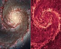 The Two-Faced Whirlpool GalaxyBoston MA (SPX) Jan 14, 2011 These images by NASA's Hubble Space Telescope show off two dramatically different face-on views of the spiral galaxy M51, dubbed the Whirlpool Galaxy. The image at left, taken in visible light, highlights the attributes of a typical spiral galaxy, including graceful, curving arms, pink star-forming regions, and brilliant blue strands of star clusters. In the image at right, most of t ... read more |