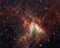 Los Angeles CA (SPX) Dec 09, 2008 A new image from NASA's Spitzer Space Telescope shows a turbulent star-forming region, where rivers of gas and stellar winds are eroding thickets of dusty material. The picture provides some of the best examples yet of the ripples of gas, or bow shocks, that can form around stars in choppy cosmic waters. "The stars are like rocks in a rushing river," said Matt Povich of the University of Wisconsin, Madison. "Powerful winds from the most massive stars at the center of the cloud produce a large flow of expanding gas. This gas then piles up with dust in front of winds from other massive stars that are pushing back against the flow." Povich is lead author of a paper describing the new findings in the Dec. 10 issue of the Astrophysical Journal. Dominating the center of the Swan is a group of massive stars, some exceeding 40 times the mass of our sun. These central stars are 100,000 to one million times as bright as the sun, and roar with radiation and fierce winds made of charged particles that speed along at up to 7.2 kilometers per hour (4.5 million miles per hour). Both the wind and radiation carve out a deep cavity at the center of the picture - an ongoing process thought to trigger the birth of new stars. The growth of this cavity pushes gas up against winds from other massive stars, causing "smiley-faced" bow shocks - three of which can be seen in the new picture. The direction of the bow shocks tells researchers exactly which way the "wind is blowing." "The bow shocks are like interstellar weather vanes, indicating the direction of the stellar winds in the nebula," said Povich. Povich and his colleagues also used Spitzer to take an infrared picture of a star-forming region called RCW 49. Both photographs are described in the same Astrophysical Journal paper, and both provide the first examples of multiple bow shocks around the massive stars of star-forming regions. Spitzer was able to spot the bow shocks because its infrared eyes can pierce intervening dust, and because it can photograph large swaths of sky quickly. Ultimately, the new observations will help researchers understand how solar systems like our own are able to form and persist in the rough, celestial seas of space. "The gas being lit up in these star-forming regions looks very wispy and fragile, but looks can be deceiving," said co-author Robert Benjamin of the University of Wisconsin, Whitewater. "These bow shocks serve as a reminder that stars aren't born in quiet nurseries but in violent regions buffeted by winds more powerful than anything we see on Earth." Share This Article With Planet Earth