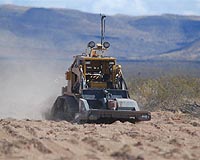 Washington DC (SPX) Feb 26, 2009 Robotic technologies were used to detect and remove unexploded ordnance from training ranges at Fort Bliss, Texas, Feb. 10 in a demonstration sponsored by the U.S. Army Environmental Command. Experts from the Army's Environmental Command joined bloggers for a special roundtable discussion on how the demonstration went and how robotics could improve safety, efficiency, and provide cost-savings in UXO removal. "There's two things that we're doing," said Kimberly Watts of the Environmental Command. "We wanted to demonstrate to make sure that the equipment was actually working the way we were hoping that it would. It did. Yes, definitely for smaller areas. Yes, we need to scale up for the larger areas, larger ranges, but, you know, there are applications for it right now." The command evaluated two basic robotics systems the Air Force Research Lab has developed: the All-Purpose Remote Transport System, or ARTS, and the Automated Ordnance Excavator, known as AOE. The systems are remotely operated with attachments that can be added to aid with brush removal and extraction, said Gene Fabian, Range Sustainment Program Manager, U.S. Army Aberdeen Test Center. A third unit that has been demonstrated previously is an Advanced Mobility Research and Development System, or AMRADS unit. It is an autonomous unit that is used frequently for physical surveying because of its ability to run on its own based on plugged-in boundaries, Fabian said. Fabian likened AMRADS to the Zamboni of hockey fame, saying its general pattern is very similar to what you'll see on the ice rink. But rather than washing away scuffs and chips, AMRADS will identify metallic anomalies in the area surveyed, before and after removal operations. "We typically use that Zamboni pattern to make sure we get complete coverage," said Fabian. "And the data for our geophysical detection devices is very clean because it's very precise, fast: it tells you where to go. It doesn't waddle and wander all over the site like a human being would be, so we actually get much better data quality by using the robotic system." Speed is critical for the U.S. Army, which currently has many areas in need of surveying and a limited supply of UXO technicians. They're looking at robotic removal options to make a big difference as they clear and maintain range sites, Fabian said. But speed isn't the only factor - costs are also expected to be lower with the robotic technologies, according to Watts. They're currently using off-the-shelf technologies fitted with the robotics package. Combine that with the time savings and increased safety, robotics UXO removal could potentially benefit the Army's Range Modernization Program as well as Army clean up, Watts said. Share This Article With Planet Earth