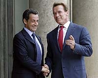 Paris (AFP) June 25, 2007 California governor and sometime film star Arnold Schwarzenegger hailed Monday in Paris the inclusiveness of new French President Nicolas Sarkozy and his impact on international relations. "I've come back here at least a hundred times," said the man who became famous as the Terminator, after a half-hour meeting with Sarkozy. "But it's the first time I'm here as the governor of the great state of California." He was accompanied onto the terrace of the Elysee palace by Sarkozy whose hand he shook at length for the benefit of the hordes of reporters and cameramen. "He is really a new, fresh blood for politics in the world," said the Austrian-born ex-body builder. "I admire him tremendously and I think that everyone in the political arena, anywhere in the world, has admiration for him because he is inclusive and he is going to put all new energy into relationships between France and other countries, and our state. "And, as I said to him, I want do anything possible to help him and we should work together," he said. "I've met the president just now to talk about environmental issues, how France and California can work together to fight global warming and improve the environment." Schwarzenegger, like former US vice-president Al Gore, has become a champion of environmental causes. In 2006, California became the first US state to undertake to cut greenhouse gas emissions, in line with the Kyoto agreement rejected by US President George W. Bush. The two men discussed the possibility of opening next year a Californian commercial mission in France and discussed France's high speed TGV train. From Paris, Schwarznegger was due to go on to London where on Tuesday morning he is scheduled to meet British Prime Minister Tony Blair whose 10-year term in office terminates this week.