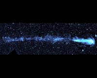 earlier related report Mira appears as a small white dot in the bulb-shaped structure at right, and is moving from left to right in this view. The shed material can be seen in light blue. The dots in the picture are stars and distant galaxies. The large blue dot at left is a star that is closer to us than Mira. The Galaxy Evolution Explorer discovered Mira's strange comet-like tail during part of its routine survey of the entire sky at ultraviolet wavelengths. When astronomers first saw the picture, they were shocked because Mira has been studied for over 400 years yet nothing like this has ever been documented before. Mira's comet-like tail stretches a startling 13 light-years across the sky. For comparison, the nearest star to our sun, Proxima Centauri, is only about 4 light-years away. Mira's tail also tells a tale of its history � the material making it up has been slowly blown off over time, with the oldest material at the end of the tail having been released about 30,000 years ago. Mira is a highly evolved, "red giant" star near the end of its life. Technically, it is called an asymptotic giant branch star. It is red in color and bloated; for example, if a red giant were to replace our sun, it would engulf everything out to the orbit of Mars. Our sun will mature into a red giant in about 5 billion years. Like other red giants, Mira will lose a large fraction of its mass in the form of gas and dust. In fact, Mira ejects the equivalent of the Earth's mass every 10 years. It has released enough material over the past 30,000 years to seed at least 3,000 Earth-sized planets or 9 Jupiter-sized ones. While most stars travel along together around the disk of our Milky Way, Mira is charging through it. Because Mira is not moving with the "pack," it is moving much faster relative to the ambient gas in our section of the Milky Way. It is zipping along at 130 kilometers per second, or 291,000 miles per hour, relative to this gas. Mira's breakneck speed together with its outflow of material are responsible for its unique glowing tail. Images from the Galaxy Evolution Explorer show a large build-up of gas, or bow shock, in front of the star, similar to water piling up in front of a speeding boat. Scientists now know that hot gas in this bow shock mixes with the cooler, hydrogen gas being shed from Mira, causing it to heat up as it swirls back into a turbulent wake. As the hydrogen gas loses energy, it fluoresces with ultraviolet light, which the Galaxy Evolution Explorer can detect. Mira, also known as Mira A, is not alone in its travels through space. It has a distant companion star called Mira B that is thought to be the burnt-out, dead core of a star, called a white dwarf. Mira A and B circle around each other slowly, making one orbit about every 500 years. Astronomers believe that Mira B has no effect on Mira's tail. Mira is also what's called a pulsating variable star. It dims and brightens by a factor of 1,500 every 332 days, and will become bright enough to see with the naked eye in mid-November 2007. Because it was the first variable star with a regular period ever discovered, other stars of this type are often referred to as "Miras." Mira is located 350 light-years from Earth in the constellation Cetus, otherwise known as the whale. Coincidentally, Mira and its "whale of a tail" can be found in the tail of the whale constellation. This mosaic is made up of individual images taken by the far-ultraviolet detector on the Galaxy Evolution Explorer between November 18 and December 15, 2006. Image credit: NASA/JPL-Caltech Community Email This Article Comment On This Article Related Links Stellar Chemistry, The Universe And All Within It