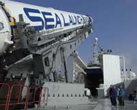 Long Beach, CA (SPX) Aug 27, 2007 Sea Launch's newly manufactured gas deflector arrived at Home Port in Long Beach, Calif., on Aug. 20. Within hours, workers unloaded the 280-metric-ton structure from a cargo vessel, the Thor Amalie, and set it on a barge alongside the pier in preparation for installation on the Odyssey Launch Platform. The gas deflector structure will be installed at the stern of the Odyssey Launch Platform, beneath the launch pad. Specialized workers are using a Strand Jack hydraulic lift and pneumatic chain hoists for aligning the structure into position. A special team responsible for the fabrication and installation of the gas deflector was assembled several months ago to formulate and execute the plan for this operation. Lost during the failed January 30 launch attempt, the one-of-a-kind gas deflector directs engine exhaust away from the platform and controls the acoustic environment. The Design Bureau for Transport Machinery (DBTM) of Moscow, Russia, managed construction of the replacement structure at the Baltisky shipyard in St. Petersburg, Russia, where the original deflector was built 10 years ago. DBTM is the prime contractor for the Sea Launch system's ground support segment. The Sea Launch vessels returned to Home Port earlier this month from a six-week stay at the Victoria Shipyard in British Columbia, where heavy industrial repairs and painting on the Launch Platform were completed. Final repairs and re-certification of various systems and associated launch support equipment on the Launch Platform are now underway at Home Port. Installation of the gas deflector is a major milestone among these activities, which are all progressing on schedule. A chronological account of the "Mission Recovery" activities is posted on the Sea Launch website at www.sea-launch.com. The Sea Launch team will transition to mission operations next month, in preparation for the launch of the Thuraya 3 satellite in October. Community Email This Article Comment On This Article Related Links Launch Pad at Space-Travel.com
