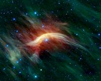 Runaway Star Plows Through SpacePasadena CA (JPL) Jan 27, 2011 A massive star flung away from its former companion is plowing through space dust. The result is a brilliant bow shock, seen here as a yellow arc in a new image from NASA's Wide-field Infrared Survey Explorer, or WISE. The star, named Zeta Ophiuchi, is huge, with a mass of about 20 times that of our sun. In this image, in which infrared light has been translated into visible colors we see ... read more |