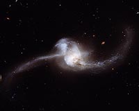 Pasadena CA (SPX) Oct 14, 2009 A recent NASA/ESA Hubble Space Telescope image captures what appears to be one very bright and bizarre galaxy, but is actually the result of a pair of spiral galaxies that resemble our own Milky Way smashing together at breakneck speeds. The product of this dramatic collision, called NGC 2623, or Arp 243, is about 250 million light-years away in the constellation of Cancer (the Crab). Not surprisingly, interacting galaxies have a dramatic effect on each other. Studies have revealed that as galaxies approach one another massive amounts of gas are pulled from each galaxy towards the centre of the other, until ultimately, the two merge into one massive galaxy. The object in the image, NGC 2623, is in the late stages of the merging process with the centres of the original galaxy pair now merged into one nucleus. However, stretching out from the centre are two tidal tails of young stars showing that a merger has taken place. During such a collision, the dramatic exchange of mass and gases initiates star formation, seen here in both the tails. The prominent lower tail is richly populated with bright star clusters - 100 of them have been found in these observations. The large star clusters that the team have observed in the merged galaxy are brighter than the brightest clusters we see in our own vicinity. These star clusters may have formed as part of a loop of stretched material associated with the northern tail, or they may have formed from debris falling back onto the nucleus. In addition to this active star-forming region, both galactic arms harbour very young stars in the early stages of their evolutionary journey. Some mergers (including NGC 2623) can result in an active galactic nucleus, where one of the supermassive black holes found at the centres of the two original galaxies is stirred into action. Matter is pulled toward the black hole, forming an accretion disc. The energy released by the frenzied motion heats up the disc, causing it to emit across a wide swath of the electromagnetic spectrum. NGC 2623 is so bright in the infrared that it belongs to the group of very luminous infrared galaxies (LIRG) and has been extensively studied as the part of the Great Observatories All-sky LIRG Survey (GOALS) project that combines data from some of the most advanced space-based telescopes, including Hubble. Additional data from infrared and X-ray telescopes can further characterise objects like active galactic nuclei and nuclear star formation by revealing what is unseen at visible wavelengths. The GOALS project includes data from NASA/ESA's Hubble Space Telescope, NASA's Spitzer Space Telescope, NASA's Chandra X-ray Observatory and NASA's Galaxy Evolution Explorer (GALEX). The joint efforts of these powerful observing facilities have provided a clearer picture of our local Universe. This data used for this colour composite were taken in 2007 by the Advanced Camera for Surveys (ACS) aboard Hubble. The observations were led by astronomer Aaron S. Evans. A team of over 30 astronomers, including Evans, recently published an important overview paper, detailing the first results of the GOALS project. Observations from ESA's X-ray Multi-Mirror Mission (XMM-Newton) telescope contributed to the astronomers' understanding of NGC 2623. Share This Article With Planet Earth