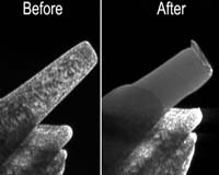 Berkeley CA (SPX) Jan 03, 2008 As structures made of metal get smaller - as their dimensions approach the micrometer scale (millionths of a meter) or less - they get stronger. Scientists discovered this phenomenon 50 years ago while measuring the strength of tin "whiskers" a few micrometers in diameter and a few millimeters in length. Many theories have been proposed to explain why smaller is stronger, but only recently has it become possible to see and record what's actually happening in tiny structures under stress. Andrew Minor, of the Materials Sciences Division in the Department of Energy's Lawrence Berkeley National Laboratory, with colleagues from Hysitron Incorporated and the General Motors Research and Development Center, used the In Situ Microscope at the National Center for Electron Microscopy (NCEM) to record what happens when pillars of nickel with diameters between 150 and 400 nanometers (billionths of a meter) are compressed under a flat punch made of diamond. The transmission electron microscope is equipped so that samples can be stressed, measured, and videotaped while being observed under the electron beam. "What controls the deformation of a metal object is the way that defects, called dislocations, move along planes in its crystal structure," Minor says. "The result of dislocation slip is plastic deformation. For example, bending a paper clip causes its trillions of dislocations per square centimeter to tangle up and multiply as they run into one another and slide along numerous slip planes." In general, mechanical deformation tends to increase the number of dislocations in a material. But for small-scale structures, with a much greater proportion of surface area to volume, the process can be very different. The videotaped images from the electron microscope helped the researchers understand why nanoscale nickel pillars are so strong by allowing them to observe changes in the microstructure of the pillars during deformation - including a never-before-seen process the researchers dubbed "mechanical annealing." (In bulk materials, annealing, a treatment that reduces the density of defects, is usually accomplished by heating.) Minor says, "The first thing we observed was that, before the test, the nanoscale pillars of nickel were full of dislocations. But as we compressed the pillar, all the dislocations were driven out of the material - literally reducing the dislocation density by 15 orders of magnitude and producing a perfect crystal. We called this effect mechanical annealing." The pillars Minor and his colleagues tested were machined from pure nickel using a focused ion beam (FIB), a new technique for small-scale mechanical-compression testing first described in 2004 by Michael Uchic of the U.S. Air Force Research Laboratory and his colleagues. The FIB technique makes it possible to create much smaller structures than the metal "whiskers" first studied in the 1950s, which are made by growing crystals. Some of the dislocations the researchers observed in the machined pillars were relatively shallow and caused by the ion beams themselves. Others extended through the crystal and were presumably pre-existing defects. Under compression, mechanical annealing caused both kinds of defect to vanish. "Essentially all the dislocations escape from the crystal at the surface, and you do not get storage of dislocations like you would in larger crystals," Minor says. "What results is a process called 'dislocation starvation,' recently proposed by William D. Nix of Stanford, among others, which has quickly became one of the leading theories of why smaller structures are stronger." Minor explains, "The idea is that if dislocations escape the material before they can interact and multiply, there are not enough active dislocations to enable the imposed deformation. The structure can only deform after new dislocations are created." This is precisely the process he and his colleagues observed with NCEM's In Situ Microscope, strong evidence that "dislocation starvation" is the correct explanation for the increased strength of small structures. What happens if a defect-free nanoscale nickel pillar continues to be compressed? Something has to give, which happens when new sources of dislocation "nucleate" in the material. As the existing dislocations disappear in the pillar because of mechanical annealing, the nucleation of new dislocation sources happens at progressively higher stresses. In the pillar structures, plastic deformation may take the form of sudden flattening, bulging, twisting, or shearing of the pillar, as bursts of new dislocations propagate through it. Or the hardened pillars, made stronger by mechanical annealing, may punch right down into the substrate - even though pillar and substrate are the same continuous piece of metal. Both processes were captured in the In Situ Microscope's dramatic videotaped experiments. The FIB machining used by the NCEM researchers produced nickel pillars that were slightly tapered, and the researchers noted that this geometry affected where and how plastic deformation occurred, generally being greater in the smaller-diameter, free end (top) of the pillar. In larger pillars, those approaching 300 nanometers in diameter, mechanical annealing was not complete, and some dislocations remained visible even after compression. Yet even these pillars exhibited enhanced strength, and progressively higher stresses were needed to continue deformation - underlining the point that it is the creation of mobile defects that determines strength in these small volumes. "The beauty of the pillar-testing geometry is that we can straightforwardly define stress. Then we can correlate the measured stresses with discrete plastic events recorded in situ and more clearly interpret the quantitative data from our experiments," says Minor. "The debate over what determines the strength of a small structure has come down to almost a chicken-and-egg question - is something 