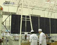 Beijing, China (SPX) Oct 06, 2008 Like an airplane, the Chinese spaceship Shenzhou-7 has a pair of wings when it's in orbit. But these wings aren't for flying. They're used for converting solar energy into electricity to power the spacecraft. From the camera circling the spacecraft, we can see these solar panels working for the first time. The panels are the biggest parts of the spacecraft, with a span 10 meters wide. There is a solar panel on each of the spacecraft's wings, which unfold when the spacecraft is in orbit. Qin Wenbo, Deputy Commander of Shenzhou-7, said, "The solar panels can unfold in two minutes after the separation of the spacecraft and the rocket. They can be rotated to obtain maximum solar reflection, regardless of the angle the spacecraft has to the sun." After the panels adjust to face the sun, they're able to start powering the spacecraft. Qin Wenbo said, "As long as there is sunlight, the panels can supply power to the spacecraft. There is also a battery to store extra electricity for when there is no sunlight." The vessel circles the Earth once every 90 minutes and has to withstand vast temperature differentials of up to 180 degrees centigrade. The ultraviolet radiation and particle collision are harmful to the panels. These require the materials used to be able to contract and expand. Qin Wenbo said, "Any chip in the panels could make a part of the panel lose its efficiency. They can distribute some extra electricity and ensure the safety of the panels." To allow the panels to obtain maximum solar reflection, scientists enable it to rotate through 360 degrees. The number of chips on the panels is also maximized. These techniques combine to give the craft all the energy it needs in space.