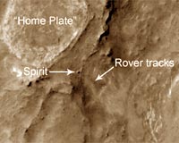 Pasadena CA (JPL) Jul 06, 2007 Spirit remains healthy after attempting to wrap up scientific studies on an outcrop that contains several tantalizing, high-silica targets. High-silica targets are of interest to scientists because water might have been involved in forming them. Spirit still has some work to do on two targets, known as "Eileen Dean" and "Innocent Bystander," before moving on to the elevated, circular plateau known as "Home Plate." On Spirit's 1,235th sol, or Martian day of exploration (June 24, 2007), the rover successfully completed Step 4 of a new computer sequence called "IDD Autoplace." (IDD stands for Instrument Deployment Device, the technical name for the rover's robotic arm.) During the test, Spirit drove to a pre-selected target and autonomously gathered scientific data. The sequence enables the rover to select a substitute "target of opportunity" if the pre-selected target is out of range, which is exactly what happened during the first two tests. Over the next month, Spirit will collect data in support of future Mars rover missions by taking images of the Sun each day with the navigation camera. These images are being used to develop an alternate method for orienting the rover. Sol-by-sol summary: In addition to daily remote science observations of the atmosphere and terrain using the panoramic camera and the miniature thermal emission spectrometer, and communication activities including morning direct-from-Earth uplinks via the rover's high-gain antenna and evening downlinks at UHF frequencies via the Mars Odyssey orbiter, Spirit completed the following activities: Sol 1234 (June 23, 2007): Spirit acquired full-color images, using all 13 filters of the panoramic camera, of outcrop exposures known as "Virginia Bell," "Nancy Warren," and "Innocent Bystander." The rover acquired panoramic camera images of a target known as "Eileen Dean." Spirit surveyed several targets using the miniature thermal emission spectrometer, including "Mary Dailey," "NancyWarren3," "Dolores Moore," "Louella Daetweiler," "NancyWarren_background," "MaryDailey2," and "Eileen Dean." Sol 1235: Upon awakening, Spirit surveyed the sky with the panoramic camera. Spirit then moved slightly closer to Eileen Dean. The rover completed Step 4 of the automatic targeting test by touching a spot that was offset from the target by about 5 centimeters (2 inches) with the Moessbauer spectrometer, acquiring a 1-by-1-by-seven mosaic of microscopic images, and placing the alpha-particle X-ray spectrometer on the spot and collecting data with the instrument. Spirit acquired navigation camera images and conducted a sky survey at low sun with the panoramic camera. Prior to the overpass of the Odyssey orbiter, the rover took images of the sky, known as "sky flats," for calibration purposes. Sol 1236: Spirit used on-board software to watch for dust devils in addition to completing standard remote-science observations. Sol 1237: Spirit rotated in place toward Eileen Dean, completing a final yaw, or pivot, of 42.8 degrees. Working autonomously, Spirit touched Eileen Dean with the Moessbauer spectrometer, acquired a 1-by-1-by-7 mosaic of microscopic images of the target, and completed alpha-particle X-ray spectrometer studies on the target. Spirit acquired images with the navigation camera. Spirit examined the rover's external calibration target with the miniature thermal emission spectrometer to verify that there was no dust contamination on the mirror as a result of recent dust-cleaning events related to Martian winds. Spirit acquired full-color images, using all 13 filters of the panoramic camera, of the rover's solar arrays, also to characterize changes in dust accumulation on the surface. Prior to the overpass of the Odyssey spacecraft, Spirit observed the Sun with the navigation camera in support of the Mars Science Laboratory rover scheduled for launch in 2009. The goal of these observations is to see if navigation camera images of the sun can be used to orient the rover. Sol 1238: In the morning, Spirit monitored dust build-up on the rover's mast, surveyed the horizon with the panoramic camera, and acquired movie frames with the navigation camera in search of dust devils. Spirit acquired microscopic images of the solar arrays, capture magnet, and filter magnet to document dust levels since the most recent dust-cleaning events on sols 1233 and 1234 (June 22-23, 2007). The rover acquired microscopic images of Eileen Dean and collected data on the target using the alpha-particle X-ray spectrometer. Spirit acquired four sets of comparative measurements with the miniature thermal emission spectrometer early in the day, in the afternoon, overnight, and early the next sol. Spirit observed the Sun with the navigation camera in support of the Mars Science Laboratory rover scheduled for launch in 2009. The goal of these observations is to see if navigation camera images of the sun can be used to orient the rover. Sol 1239 (June 28, 2007): The activities for this day were mostly a repeat of those of the previous sol, except for the four sets of measurements with the miniature thermal emission spectrometer. Spirit acquired 15 hours and 23 minutes of data from Eileen Dean using the alpha-particle X-ray spectrometer. Odometry: As of sol 1237 (June 26, 2007), Spirit's total odometry was 7,147.93 meters (4.44 miles). Community Email This Article Comment On This Article Related Links Mars Rovers at JPL Mars Rovers at Cornell Mars News and Information at MarsDaily.com Lunar Dreams and more