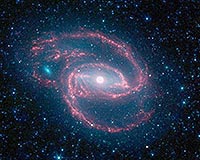 Pasadena CA (SPX) Jul 24, 2009 NASA's Spitzer Space Telescope has imaged a wild creature of the dark - a coiled galaxy with an eye-like object at its center. The galaxy, called NGC 1097, is located 50 million light-years away. It is spiral-shaped like our Milky Way, with long, spindly arms of stars. The "eye" at the center of the galaxy is actually a monstrous black hole surrounded by a ring of stars. In this color-coded infrared view from Spitzer, the area around the invisible black hole is blue and the ring of stars, white. The black hole is huge, about 100 million times the mass of our sun, and is feeding off gas and dust along with the occasional unlucky star. Our Milky Way's central black hole is tame by comparison, with a mass of a few million suns. "The fate of this black hole and others like it is an active area of research," said George Helou, deputy director of NASA's Spitzer Science Center at the California Institute of Technology in Pasadena. "Some theories hold that the black hole might quiet down and eventually enter a more dormant state like our Milky Way black hole." The ring around the black hole is bursting with new star formation. An inflow of material toward the central bar of the galaxy is causing the ring to light up with new stars. "The ring itself is a fascinating object worthy of study because it is forming stars at a very high rate," said Kartik Sheth, an astronomer at NASA's Spitzer Science Center. Sheth and Helou are part of a team that made the observations. In the Spitzer image, infrared light with shorter wavelengths is blue, while longer- wavelength light is red. The galaxy's red spiral arms and the swirling spokes seen between the arms show dust heated by newborn stars. Older populations of stars scattered through the galaxy are blue. The fuzzy blue dot to the left, which appears to fit snuggly between the arms, is a companion galaxy. "The companion galaxy that looks as if it's playing peek-a-boo through the larger galaxy could have plunged through, poking a hole," said Helou. "But we don't know this for sure. It could also just happen to be aligned with a gap in the arms." Other dots in the picture are either nearby stars in our galaxy, or distant galaxies. This image was taken during Spitzer's "cold mission," which lasted more than five-and-a- half years. The telescope ran out of coolant needed to chill its infrared instruments on May 15, 2009. Two of its infrared channels will still work perfectly during the new "warm mission," which is expected to begin in a week or so, once the observatory has been recalibrated and warms to its new temperature of around 30 Kelvin (about minus 406 degrees Fahrenheit). Share This Article With Planet Earth