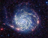 Los Angeles CA (SPX) Jul 22, 2008 The Pinwheel galaxy is gussied up in infrared light in a new picture from NASA's Spitzer Space Telescope. The fluffy-looking galaxy, officially named Messier 101, is dominated by a mishmash of spiral arms. In Spitzer's new view, in which infrared light is color coded, the galaxy sports a swirling blue center and a unique, coral-red outer ring. A new paper appearing July 20 in the Astrophysical Journal explains why this outer ring stands out. According to the authors, the red color highlights a zone where organic molecules called polycyclic aromatic hydrocarbons, which are present throughout most of the galaxy, suddenly disappear. Polycyclic aromatic hydrocarbons are dusty, carbon-containing molecules found in star nurseries, and on Earth in barbeque pits, exhaust pipes and anywhere combustion reactions take place. Scientists believe this space dust has the potential to be converted into the stuff of life. "If you were going look for life in Messier 101, you would not want to look at its edges," said Karl Gordon of the Space Telescope Science Institute in Baltimore, Md. "The organics can't survive in these regions, most likely because of high amounts of harsh radiation." The Pinwheel galaxy is located about 27 million light-years away in the constellation Ursa Major. It has one of the highest known gradients of metals (elements heavier than helium) of all nearby galaxies in our universe. In other words, its concentrations of metals are highest at its center, and decline rapidly with distance from the center. This is because stars, which produce metals, are squeezed more tightly into the galaxy's central quarters. Gordon and his team used Spitzer to learn about the galaxy's gradient of polycyclic aromatic hydrocarbons. The astronomers found that, like the metals, the polycyclic aromatic hydrocarbons decrease in concentration toward the outer portion of the galaxy. But, unlike the metals, these organic molecules quickly drop off and are no longer detected at the very outer rim. "There's a threshold at the rim of this galaxy, where the organic material is getting destroyed," said Gordon. The findings also provide a better understanding of the conditions under which the very first stars and galaxies arose. In the early universe, there were not a lot of metals or polycyclic aromatic hydrocarbons around. The outskirt of the Pinwheel galaxy therefore serves as a close-up example of what the environment might look like in a distant galaxy. In this image, infrared light with a wavelength of 3.6 microns is colored blue; 8-micron light is green; and 24-micron light is red. All three of Spitzer instruments were used in the study: the infrared array camera, the multiband imaging photometer and the infrared spectrograph. Other authors of the paper include Charles Engelbracht, George Rieke, Karl A. Misselt, J.D. Smith and Robert Kennicutt, Jr. Of the University of Arizona, Tucson. Smith is also associated with the University of Toledo, Ohio, and Kennicutt is also associated with the University of Cambridge, England. Community Email This Article Comment On This Article Related Links Spitzer Stellar Chemistry, The Universe And All Within It