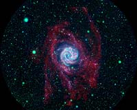 Pasadena CA (SPX) Apr 18, 2008 A new image from NASA's Galaxy Evolution Explorer shows baby stars sprouting in the backwoods of a galaxy -- a relatively desolate region of space more than 100,000 light-years from the galaxy's bustling center. The striking image, a composite of ultraviolet data from the Galaxy Evolution Explorer and radio data from the National Science Foundation's Very Large Array in New Mexico, shows the Southern Pinwheel galaxy, also known simply as M83. In the new view, the main spiral, or stellar, disk of M83 looks like a pink and blue pinwheel, while its outer arms appear to flap away from the galaxy like giant red streamers. It is within these so-called extended galaxy arms that, to the surprise of astronomers, new stars are forming. "It is absolutely stunning that we find such an enormous number of young stars up to 140,000 light-years away from the center of M83," said Frank Bigiel of the Max Planck Institute for Astronomy in Germany, lead investigator of the new Galaxy Evolution Explorer observations. For comparison, the diameter of M83 is only 40,000 light-years across. Some of the "outback" stars in M83's extended arms were first spotted by the Galaxy Evolution Explorer in 2005. Remote stars were also discovered around other galaxies by the ultraviolet telescope over subsequent years. This came as a surprise to astronomers because the outlying regions of a galaxy are assumed to be relatively barren and lack high concentrations of the ingredients needed for stars to form. The newest Galaxy Evolution Explorer observations of M83 (colored blue and green) were taken over a longer period of time and reveal many more young clusters of stars at the farthest reaches of the galaxy. To better understand how stars could form in such unexpected territory, Bigiel and his colleagues turned to radio observations from the Very Large Array (red). Light emitted in the radio portion of the electromagnetic spectrum can be used to locate gaseous hydrogen atoms, or raw ingredients of stars. When the astronomers combined the radio and Galaxy Evolution Explorer data, they were delighted to see they matched up. "The degree to which the ultraviolet emission and therefore the distribution of young stars follows the distribution of the atomic hydrogen gas out to the largest distances is absolutely remarkable," said Fabian Walter, also of the Max Planck Institute for Astronomy, who led the radio observations of hydrogen in the galaxy. The astronomers speculate that the young stars seen far out in M83 could have formed under conditions resembling those of the early universe, a time when space was not yet enriched with dust and heavier elements. "Even with today's most powerful telescopes, it is extremely difficult to study the first generation of star formation. These new observations provide a unique opportunity to study how early generation stars might have formed," said co-investigator Mark Seibert of the Observatories of the Carnegie Institution of Washington in Pasadena. M83 is located 15 million light-years away in the southern constellation Hydra. Other investigators include: Barry Madore of The Observatories of the Carnegie Institution of Washington; Armando Gil de Paz of the Complutense University of Madrid, Spain; David Thilker of Johns Hopkins University, Baltimore; Elias Brinks of the University of Hertfordshire, England; and Erwin de Blok of the University of Cape Town, South Africa. The California Institute of Technology in Pasadena leads the Galaxy Evolution Explorer mission and is responsible for science operations and data analysis. NASA's Jet Propulsion Laboratory, also in Pasadena, manages the mission and built the science instrument. Caltech manages JPL for NASA. The mission was developed under NASA's Explorers Program managed by NASA's Goddard Space Flight Center, Greenbelt, Md. Researchers sponsored by Yonsei University in South Korea and the Centre National d'Etudes Spatiales (CNES) in France collaborated on this mission. The Very Large Array is part of the National Radio Astronomy Observatory, a facility of the National Science Foundation, operated under cooperative agreement by Associated Universities, Inc. Community Email This Article Comment On This Article Related Links Galaxy Evolution Explorer Stellar Chemistry, The Universe And All Within It