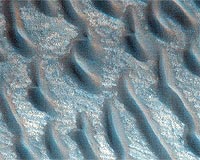 Tuscon AZ (SPX) Oct 30, 2008 One of the most fun and fascinating aspects of space exploration is discovering geological processes and terrain different from those found on our home planet, says Matt Balme, who is leading a team that's decoding Martian mystery landscapes known as Transverse Aeolian Ridges or TARs. Balme, a research scientist with the Tucson-based Planetary Science Institute, says TARs have no exact analog on Earth. These fields of rippled sand, found over large swaths of Mars, are smaller than the planet's gigantic dunes but larger than the sand ripple fields found on Earth. Wind-driven particles form TARs. They're called "Aeolian Ridges" because planetary scientists refer to phenomena involving air movement as "Aeolian processes." The ridges assume many shapes, such as simple ripples, forked ripples, snake-like sinuous waves, barchan-like (crescent-shaped) forms or complex, overlapping networks. TARs are worth studying because they are an intriguing scientific mystery, hold clues to past and present climate processes, and because they're death to rovers, says Balme, who also is a research fellow at Great Britain's Open University and based in Milton Keynes, England. In 2005, NASA's Opportunity rover bogged down for six weeks with its wheels firmly mired in what Balme believes was a small TAR. So it's important to know where TARs are located to avoid landing among them on future rover missions, he said. Balme and his colleagues have conducted a pole-to-pole planet survey of more than 10,000 images taken by the Mars Orbiter Camera, which is flying aboard the Mars Global Surveyor spacecraft. They found that TARs: + Are more common in the southern hemisphere than in the northern. + Are found in an equatorial belt between 30 degrees north and 30 degrees south latitude. + Exist in two distinct environments: near layered terrain or adjacent to Large Dark Dunes (LLDs). Those adjacent to dunes have formed recently, while those near layered terrain are millions of years old. + Are abundant in the Meridiani Planum region and in southern-latitude craters. The Opportunity rover's TAR encounter provided additional data, showing that at least that TAR was composed of an outer layer of granule-sized material ranging from about 2mm to 5 mm in diameter, Balme said. Beneath this was a mixed mass of fine and coarse particles. TARs need two things to form, Balme explained: a supply of sediment and strong winds. The sediment requirement helps explain why they're found near dunes and layered terrain and why they're confined to a central belt around the planet, Balme said. Both dunes and layered terrain (which could have been formed by ancient sand dunes, ocean or lake deposits, or layers of volcanic ash) provide the raw material. Steep slopes also can provide additional particles for TAR formation as they erode. The lack of steep slopes and other sources of coarse and fine material in the middle to far north and south latitudes may explain the absence of TARs in those areas, he said. The TARs near layered terrain are generally several million years old and inactive, while the ones near LLDs are young and may still be actively forming and moving. "My theory is that the very young TARs are found near the Large Dark Dunes, which are also very young, because the sand blowing off the dunes provides the energy needed to form TARs," Balme said. "Meanwhile you have areas near layered landforms that used to have active sediment transport, but no longer. This shows a dynamic environment that has changed, and we might be able to use TARs as paleo markers to help decipher ancient climates." Current Martian circulation models don't provide much evidence that wind patterns and atmospheric densities on Mars were significantly different in the past than from what they are today. "But I think the geology we are seeing suggests that there might have been different patterns and densities," Balme said. "The observations we're getting now from Mars Global Surveyor and the HiRISE camera (flying aboard the Mars Reconnaissance Orbiter) are giving us really good data to drive the models." Although Blame and his team have discovered much about TARs, they still don't know what materials compose the various TAR fields or why they're seeing these large features on Mars but not on Earth. "Over the next couple of years we should be seeing many more images from HiRISE that can give us more information, for example, about the heights versus spacing and whether TARs have more in common with dunes or the ripple fields found on Earth," Balme said. "And they could provide insights into present and past climate patterns as we learn more about them and use that data to help drive general circulation models." HiRISE images of the same areas of the planet taken over long time intervals also might show small movements within some of the TAR fields, indicating which ones are still active and possibly demonstrating how they form, Blame said. Other researchers working with Balme include: Daniel Berman and Mary Bourke, of the Planetary Science Institute; Scot Rafkin, of Southwest Research Institute; and James Zimbelman of the Smithsonian Institution. Balme's TARs research is supported by NASA's Mars Data Analysis Program. Community Email This Article Comment On This Article Related Links Planetary Science Institute Mars News and Information at MarsDaily.com Lunar Dreams and more