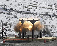 Cape Canaveral FL (SPX) Feb 02, 2009 The development of NASA's next-generation crew launch vehicle, the Ares I rocket, took another step forward Thursday as Alliant Techsystems, or ATK, successfully tested a critical piece. ATK conducted a full-scale separation test of the forward skirt extension for the Ares I-X flight test at its facility in Promontory, Utah. The Ares I-X test launch is scheduled to lift off from NASA's Kennedy Space Center in Florida during 2009. The rocket will climb about 25 miles in altitude during a two-minute powered flight. The launch will culminate with a test of the separation of the first stage from the rocket and deployment of the accompanying parachute system that will return the first stage to Earth for data and hardware recovery. Yesterday's test simulated the separation event that will take place following the first stage flight of Ares I-X. During the Ares I-X flight, the booster will separate at the frustum, a cone-shaped piece that attaches the first stage to the larger diameter upper stage. "The Ares I-X team is pleased with the completion of this key test that will provide important data leading up to the launch of the Ares I-X flight," said Steve Davis, deputy mission manager for the Ares I-X test flight at NASA's Marshall Space Flight Center in Huntsville, Ala. At an altitude of about 15,000 feet, the nose cone will be jettisoned, deploying the pilot parachute. The pilot chute will, in turn, deploy the drogue parachute, which will re-orient the booster vertically and slow it to acceptable conditions for main parachute deployment. At about 4,000 feet, the separation at the base of the forward skirt extension occurs, pulling out the three main chutes packed inside. Test objectives included demonstrating that the linear shaped charge used to separate the forward skirt extension severed cleanly and measuring the shock created by that charge. The data will be used to analyze the system and prepare for the Ares I-X flight test and the development of the Ares I crew launch vehicle. The forward skirt extension is built to withstand the loads of the first stage and support the weight of the upper stage. The component is built as one solid piece of aluminum forged into a 6-foot-long by 12-foot-diameter cylinder with a unique internal support structure that houses three newly-designed main parachutes. Its state-of-the-art design will withstand the force imparted at main chute deployment. "This was an important milestone for the program, as it validates key parameters to support the upcoming Ares I-X flight test," said Mike Kahn, executive vice president of ATK Space Systems. "The program is one step closer to the flight test of Ares I-X." Share This Article With Planet Earth