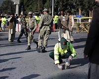 Islamabad (AFP) Dec 2, 2009 A suicide bomber attacked Pakistan's navy headquarters in the capital Islamabad on Wednesday, killing a naval policeman and injuring 11 others in the latest blast in the insurgency-hit nation. A young man walked up to a checkpoint at the entrance to the complex and detonated his explosives when challenged by security forces. The blast scattered body parts across the busy city centre road, police and witnesses said. Islamist insurgents frequently target military installations and attacks have intensified as Islamabad pursues a fierce military offensive, under Western pressure to do more to eliminate Taliban and Al-Qaeda sanctuaries. Wednesday's blast came after US President Barack Obama announced he was sending 30,000 more troops to battle the Taliban in Afghanistan, and said that success in the war there depended on Pakistan's own fight against extremism. Fazeel Asghar, the city authorities' top administrative official, told reporters that a man aged around 17 or 18 and wearing a suicide jacket approached the heavily-guarded naval complex on foot. "Security officials checked him and one navy police constable, Mohammad Ashraf, asked him to take off his coat. The bomber then blew himself up and the navy constable died in the blast," he said. Navy spokesman Captain Mubeen Bajwa said security guards stopped the bomber after a taxi driver complained about his suspicious behaviour. "A total of 11 people were injured, including five soldiers of the Pakistan navy and six civilians. One of them is critically injured," he said. Witnesses described the scene in the aftermath of the blast, which shattered car windows and left blood streaked across the road: "I was in a nearby street when I heard a loud explosion," said witness Imtiaz Ali. "When I reached the main Margalla Road there was smoke near the navy complex. I saw three soldiers lying wounded." President Asif Ali Zardari strongly condemned the suicide attack, saying that "such incidents would not deter the government's resolve to fight terrorism and extremism from the country", a government statement said. The attack came a day after a Pakistani provincial lawmaker was killed in a suicide attack in the northwestern valley of Swat, and as Taliban insurgents have intensified attacks to avenge the military's multi-pronged offensive. The military are a frequent target: a brazen raid and hostage siege at the army headquarters in the garrison city of Rawalpindi in October hit the heart of the country's most powerful establishment. Islamabad itself was last hit in late October, when twin suicide blasts tore through the International Islamic University, killing up to five people. Security has drastically deteriorated in Pakistan since Islamabad joined the US-led "war on terror" and hundreds of Taliban and Al-Qaeda-linked militants fled into the tribal belt after the 2001 invasion of Afghanistan. More than 2,570 people have been killed in suicide blasts and attacks here since July 2007, when the insurgency intensified. Islamabad has this year launched multiple offensives against the Taliban across the country's northwest, sparking a wave of retaliatory suicide bombings, but its Western allies are urging the administration to do more. Laying out his new Afghan strategy late Tuesday, Obama vowed to start a withdrawal of troops from the war-torn nation in July 2011. He praised Pakistan's operations in South Waziristan, but indicated that pressure would remain on Islamabad. "We will strengthen Pakistan's capacity to target those groups that threaten our countries, and have made it clear that we cannot tolerate a safe-haven for terrorists whose location is known, and whose intentions are clear," he said. Washington and London have expressed concern that militants hide out in Pakistan's mountainous and lawless border regions, regrouping and training before slipping over the border to target foreign forces. US Secretary of State Hillary Clinton on Wednesday pledged an "enduring" US and allied commitment to Afghanistan and Pakistan, adding Washington that would also significantly expand support to Pakistan. "It should be clear to everyone that -- unlike the past -- the United States and our allies and partners have an enduring commitment to Afghanistan, Pakistan, and the region," Clinton told US lawmakers. She added: "We will significantly expand support intended for Pakistan to develop the potential of their people." Share This Article With Planet Earth