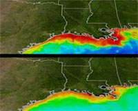 Greenbelt MD (SPX) Jul 14, 2008 It's summertime and people are flocking to the coasts around the country. But when summer storms arrive, it's not only beach-goers who are affected; the rains can also have an impact on living creatures far below the ocean surface. Summer storms sweep fertilizers into the rivers and streams and carry them to the shoreline. Once the plumes of storm and river runoff reach the coast, the nutrients in fertilizers can feed tiny ocean plants, called phytoplankton, which can bloom and create "dead zones," or oxygen-deficient areas. Phytoplankton growth utilizes the dissolved oxygen in the water. Ocean dead zones are regions where water becomes stripped of its dissolved oxygen. These "hypoxic" (low oxygen) and "anoxic" (no oxygen) conditions can prove lethal for many marine species, changing the biology and chemistry of the ocean. In a few places throughout the world, dead zones occur throughout the year, but summer storms can intensify agricultural runoff, resulting in big phytoplankton blooms that trigger the phenomena. These images show how ocean color changes from summer (top) to winter (bottom) in the Gulf of Mexico. They were created from the Moderate Resolution Imaging Spectroradiometer (MODIS) instrument that flies about NASA's Aqua satellite. Reds and oranges represent high concentrations of phytoplankton and river sediment.Credit: Goddard SVS > Summer: larger image > Winter: larger image Phytoplankton are critical to life and are particularly important marine organisms. These microscopic aquatic plants are dispersed throughout the world's oceans. The plants' distribution is driven by available light, the presence of nutrients, and physical processes like ocean circulation and upwelling. "It's safe to say, with a few exceptions, that all life in the ocean ultimately depends on phytoplankton for its nutrition," notes NASA oceanographer Gene Feldman, Goddard Space Flight Center, Greenbelt, Md. Under certain conditions, excessive phytoplankton growth can result in a dead zone. Dead zones form when large quantities of organic matter, present from the excessive blooms of phytoplankton at the surface, sink to the bottom. After the organic matter or dead phytoplankton sink, bacteria break the dead or decaying phytoplankton down in a process known as aerobic decomposition, releasing carbon dioxide but absorbing oxygen as they work. The resulting low oxygen conditions can cover expansive areas, killing the oxygen-dependent aquatic species, such as fish, that cannot escape their reach, or driving them out of their habitat. Summer storms intensify the runoff of fertilizers from lawns and farmland, which seep into the rivers and streams that comprise a local watershed and provide a jolt of nutrients to phytoplankton that live along the shore. Excessive nutrients from human activity are one reason many dead zones occur at the mouth of large rivers and in the bays along the shore. This image illustrates the flow of water from tributaries in the middle of the United States, down the Mississippi River, and into the Gulf of Mexico. Human activity far from the ocean can have a dramatic impact on life in the sea, as many of the nutrients, fertilizers, and pollutants that impact the health of the Mississippi River and Gulf of Mexico originate far inland. Credit: Goddard Conceptual Image Lab > Larger image For a decade, scientists have used satellite measurements of ocean color to quantify the global amount of phytoplankton and to link its variability to environmental factors. The Sea-viewing Wide Field-of-view Sensor (SeaWiFS) allows researchers to measure how blue or how green the ocean is, and from those measurements they determine the amount of phytoplankton in the global oceans. SeaWiFS, a partnership between NASA and industry, is in its tenth year in orbit and measures ocean color, which can be directly related to levels of phytoplankton throughout the world's oceans. Satellites do not actually "see" dead zones, as satellites cannot monitor what happens at the bottom of the ocean. Satellites can monitor the distribution and abundance of phytoplankton and other materials in the global oceans at the ocean's surface, including conditions that may lead to phenomena like dead zones. As summer heats up, this "eye in the sky" may soon detect big phytoplankton blooms edging the shore, which spells trouble for aquatic life below. Community Email This Article Comment On This Article Related Links SeaWiFS MODIS Weather News at TerraDaily.com