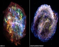 Boston MA (SPX) Dec 18, 2009 At a very early age, children learn how to classify objects according to their shape. Now, new research suggests studying the shape of the aftermath of supernovas may allow astronomers to do the same. A new study of images from NASA's Chandra X-ray Observatory on supernova remnants - the debris from exploded stars - shows that the symmetry of the remnants, or lack thereof, reveals how the star exploded. This is an important discovery because it shows that the remnants retain information about how the star exploded even though hundreds or thousands of years have passed. "It's almost like the supernova remnants have a 'memory' of the original explosion," said Laura Lopez of the University of California at Santa Cruz, who led the study. "This is the first time anyone has systematically compared the shape of these remnants in X-rays in this way." Astronomers sort supernovas into several categories, or "types," based on properties observed days after the explosion and which reflect very different physical mechanisms that cause stars to explode. But, since observed remnants of supernovas are leftover from explosions that occurred long ago, other methods are needed to accurately classify the original supernovas. Lopez and colleagues focused on the relatively young supernova remnants that exhibited strong X-ray emission from silicon ejected by the explosion so as to rule out the effects of interstellar matter surrounding the explosion. Their analysis showed that the X-ray images of the ejecta can be used to identify the way the star exploded. The team studied 17 supernova remnants both in the Milky Way galaxy and a neighboring galaxy, the Large Magellanic Cloud. For each of these remnants there is independent information about the type of supernova involved, based not on the shape of the remnant but, for example, on the elements observed in it. The researchers found that one type of supernova explosion - the so-called Type Ia - left behind relatively symmetric, circular remnants. This type of supernova is thought to be caused by a thermonuclear explosion of a white dwarf, and is often used by astronomers as "standard candles" for measuring cosmic distances. On the other hand, the remnants tied to the "core-collapse" supernova explosions were distinctly more asymmetric. This type of supernova occurs when a very massive, young star collapses onto itself and then explodes. "If we can link supernova remnants with the type of explosion," said co-author Enrico Ramirez-Ruiz, also of University of California, Santa Cruz, "then we can use that information in theoretical models to really help us nail down the details of how the supernovas went off." Models of core-collapse supernovas must include a way to reproduce the asymmetries measured in this work and models of Type Ia supernovas must produce the symmetric, circular remnants that have been observed. Out of the 17 supernova remnants sampled, ten were classified as the core-collapse variety, while the remaining seven of them were classified as Type Ia. One of these, a remnant known as SNR 0548-70.4, was a bit of an "oddball." This one was considered a Type Ia based on its chemical abundances, but Lopez finds it has the asymmetry of a core-collapse remnant. "We do have one mysterious object, but we think that is probably a Type Ia with an unusual orientation to our line of sight," said Lopez. "But we'll definitely be looking at that one again." While the supernova remnants in the Lopez sample were taken from the Milky Way and its close neighbor, it is possible this technique could be extended to remnants at even greater distances. For example, large, bright supernova remnants in the galaxy M33 could be included in future studies to determine the types of supernova that generated them. The paper describing these results appeared in the November 20 issue of The Astrophysical Journal Letters. NASA's Marshall Space Flight Center in Huntsville, Ala., manages the Chandra program for NASA's Science Mission Directorate in Washington. The Smithsonian Astrophysical Observatory controls Chandra's science and flight operations from Cambridge, Mass. Share This Article With Planet Earth