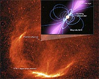 Stanford CA (SPX) Oct 23, 2008 About three times a second, the rotating corpse of a 10,000-year-old star sweeps a beam of gamma rays toward Earth. This object, known as a pulsar, is the first one known to "blink" at Earth only in gamma rays, and was discovered by an orbiting observatory launched in June with significant involvement from researchers at Stanford and the SLAC National Accelerator Laboratory. "This is the first example of a new class of pulsars that will give us fundamental insights into how stars work," said Stanford astrophysicist Peter Michelson, the principal investigator for the Large Area Telescope (LAT), which is carried aboard NASA's orbiting observatory, the Fermi Gamma-ray Space Telescope. Researchers at SLAC get the first peek at the celestial data beamed down from LAT before sending it on to an international collaboration of scientists for analysis. The gamma-ray-only pulsar lies within a supernova remnant known as CTA 1, about 4,600 light-years away from Earth in the constellation Cepheus. Its lighthouse-like beam of gamma rays sweeps across Earth every 316.86 milliseconds and emits 1,000 times the energy of our sun. Details of the discovery appear in the Oct. 16 edition of Science Express. A pulsar is a rapidly spinning neutron star, the crushed core left behind when a massive star explodes. Astronomers have cataloged nearly 1,800 pulsars. Although most were found through their pulses of radio waves, some of these objects also beam energy in other forms, including visible light, X-rays and gamma rays, each of which occupy their own spot on the electromagnetic spectrum. Unlike previously discovered pulsars, the source in CTA 1 appears to blink only in gamma-ray energies and offers researchers a new way to study the stars in our universe. Scientists think CTA 1 is only the first of a large population of similar objects. "The LAT provides us with a unique probe of the galaxy's pulsar population, revealing objects we would not otherwise even know exist," said Steve Ritz, NASA's project scientist for the Fermi observatory. He is stationed at NASA's Goddard Space Flight Center in Greenbelt, Md. The pulsar in CTA 1 is not located at the center of the supernova remnant's expanding gaseous shell. Supernova explosions can be asymmetrical, often imparting a "kick" that sends the neutron star careening through space. Based on the remnant's age and the pulsar's distance from its center, astronomers believe the neutron star is moving at about a million miles per hour. It is possible that the pulsar is emitting radio waves-thus far unseen-in addition to gamma rays. "The radio beam probably never swings toward Earth, so we never see it. But the wider gamma-ray beam does sweep our way," explained NASA's Alice Harding. The LAT scans the entire sky every three hours and detects photons with energies ranging from 20 million to more than 300 billion times the energy of visible light. The instrument sees about one gamma ray each minute from CTA 1. That's enough for scientists to piece together the neutron star's pulsing behavior, its rotation period and the rate at which it is slowing down. A pulsar's beams arise because neutron stars possess intense magnetic fields and rotate rapidly. Charged particles stream outward from the star's magnetic poles at nearly the speed of light to create the gamma-ray beams the telescope sees. Because the beams are powered by the neutron star's rotation, they gradually slow the pulsar's spin. In the case of CTA 1, the rotation period is increasing by about one second every 87,000 years. This measurement is also vital to understanding the dynamics of the pulsar's behavior and can be used to estimate the pulsar's age. From the slowing period, researchers have determined that the pulsar is actually powering all the activity in the nebula where it resides. "This observation shows the power of the LAT," Michelson says. "It is so sensitive that we can now discover new types of objects just by observing their gamma-ray emissions." The list of authors for the article in Science Express demonstrates the collaborative nature of the gamma-ray research. The list contains scientists from 48 research groups in the United States, Italy, France, Sweden, Japan and Germany. Community Email This Article Comment On This Article Related Links Stanford Stellar Chemistry, The Universe And All Within It