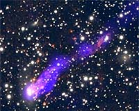 Science@NASA East Lansing MI (SPX) Oct 19, 2007 What a view! It's late summer, after dark, and you're flat on your back in a sleeping bag watching the camp fire's last embers drift up to the heavens. Overhead a magnificent band of stars divides the night-it's the Milky Way. Now, imagine that scene doubled in brightness and beauty. No, that's not quite right. Imagine an entire galaxy of stars spinning overhead. The galaxy's blue-white core of young stars is surrounded by yellow octopus-arms of older siblings. Off to one side a faint red column of gas meanders away from the starry whirlpool and turns in mid-sky toward ... you. Astronomers using NASA's Chandra X-ray observatory have found a place in the Universe where the view may be like that. "It's near a galaxy named ESO 137-001," says Ming Sun of Michigan State University who led the study. ESO 137-001 is a member of Abell Cluster 3627-a swarm of galaxies 65 Megaparsecs (212 million light years) from Earth. ESO 137-001 stands out among other galaxies in the cluster because it has a gigantic comet-like tail peppered with young stars. "We call them orphan stars," says MSU team member Megan Donahue, "because they are separating from their parent." No one knows if there is life in these orphan star systems, but if there are lifeforms, "they would have a fantastic view," says Sun. Here on Earth we see our own galaxy, the Milky Way, from the inside. Too bad! The interior of the Milky Way is choked with space-dust, which dims our view of all but the nearest stars. On any given summer night, the Milky Way displays only a fraction of its total glory. If only we could be lifted out of our busy, dusty spiral arm. That's exactly what is happening in ESO 137-001, explains Sun. "Orphan stars are drifting away from their galaxy" to a point where the entire galaxy can be seen in hindsight. It's a stargazers dream come true. How did this happen? Donahue explains: "Abell Cluster 3627 is filled with a diffuse atmosphere of hot gas which surrounds all the galaxies in the cluster. ESO 137-001 is moving through this gas as it plunges toward the cluster's center. The entire galaxy, therefore, feels a sort of 'hot wind' in its face." Note: Stick your head out the window of a car driving through Death Valley and you will feel a hot wind, too. It's the same concept. "The wind pushes raw, star-forming gas out the back of ESO 137-001, creating the comet-like tail where orphan stars are born." This isn't the first time astronomers have detected stars being born outside a parent galaxy. "Other examples include Stephen's Quintet and NGC 4388," says Sun. "ESO 137-001 is special, however, because the rate of orphan star formation is so high: 36 to 5700 times greater than anything we've ever seen before." Sun estimates there could be a million stars spilling out of ESO 137-001, a million unbelievable night skies. Eventually, as the stars slowly drift away from their parent, the view will change: ESO 137-001 will fade into the distance and a dark inter-galactic void will fill the night sky. The only stars in view then will be the orphans themselves--"a handful of very nearby, very bright points of light," says Donahue. "A few billion years from now these stars will be in a pretty lonely region of space." Such isolation could be a good thing if life ever struggles to gain a foothold in these systems: "Planets circling orphan stars may be less affected by the occasional 'comet of death' perturbed out of its orbit by gravitational interactions with a passing star," speculates Donahue. The orphan stars of ESO 137-001 may represent a whole population of cosmic wanderers, blessed in the beginning with breathtaking nights and in the end with the safety of the void. How many more are out there? No one knows. "This," says Donahue, "is why we explore." This month astronomers are celebrating the 8th anniversary of the Chandra X-ray Observatory with an "8 Years of Chandra" symposium in Huntsville, Alabama. Stay tuned to Science@NASA for reports of new discoveries and future plans revealed at the meeting. Community Email This Article Comment On This Article Related Links Michigan State University Stellar Chemistry, The Universe And All Within It