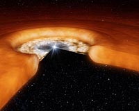 earlier related report Infant stars form from a disc of gas and dust that surrounds the new star and, later, may also provide the material for a planetary system. Because the closest star-forming regions to us are about 500 light-years away, these discs appear very small on the sky, and their study requires special techniques to be able to probe the finer details. This is best done with interferometry, a technique that combines the light of two or more telescopes so that the level of detail revealed corresponds to that which would be seen by a telescope with a diameter equal to the separation between the interferometer elements, typically 40 to 200 metres. ESO's Very Large Telescope Interferometer (VLTI) has allowed astronomers to reach a resolution of about a milli-arcsecond, an angle equivalent to the size of the full stop at the end of this sentence seen from a distance of about 50 kilometres. "So far interferometry has mostly been used to probe the dust that closely surrounds young stars," says Eric Tatulli from Grenoble (France), who co-led this international project. "But dust is only one percent of the total mass of the discs. Their main component is gas, and its distribution may define the final architecture of planetary systems that are still forming." The ability of the VLTI and the AMBER instrument to take spectra while probing objects at milli-arcsecond resolution has allowed astronomers to map the gas. Astronomers studied the inner gaseous environments of six young stars belonging to the family of Herbig Ae/Be objects. These objects have masses a few times that of our Sun and are still forming, increasing in mass by swallowing material from the surrounding disc. The team used these observations to show that gas emission processes can be used to trace the physical processes acting close to the star. "The origin of gas emissions from these young stars has been under debate until now, because in most earlier investigations of the gas component, the spatial resolution was not high enough to study the distribution of the gas close to the star," says co-leader Stefan Kraus from Bonn in Germany. "Astronomers had very different ideas about the physical processes that have been traced by the gas. By combining spectroscopy and interferometry, the VLTI has given us the opportunity to distinguish between the physical mechanisms responsible for the observed gas emission." Astronomers have found evidence for matter falling into the star for two cases, and for mass outflow in four other stars, either in an extended stellar wind or in a disc wind. It also seems that, for one of the stars, dust may be present closer to the star than had been generally expected. The dust is so close that the temperature should be high enough for it to evaporate, but since this is not observed, it must mean that gas shields the dust from the star's light. These new observations demonstrate that it is now possible to study gas in the discs around young stars. This opens new perspectives for understanding this important phase in the life of a star. "Future observations using VLTI spectro-interferometry will allow us to determine both the spatial distribution and motion of the gas, and might reveal whether the observed line emission is caused by a jet launched from the disc or by a stellar wind", concludes Stefan Kraus. *Original Papers: * The origin of hydrogen line emission for five Herbig Ae/Be stars spatially resolved by VLTI/AMBER spectro-interferometry, Kraus, S.; Hofmann, K.-H.; Benisty, M.; Berger, J.-P.; Chesneau, O.; Isella, A.; Malbet, F.; Meilland, A.; Nardetto, N.; Natta, A.; Preibisch, T.; Schertl, D.; Smith, M.; Stee, P.; Tatulli, E.; Testi, L.; Weigelt, G. , Astronomy and Astrophysics Volume 489, Issue 3, 2008, pp.1157-1173, and Spatially resolving the hot CO around the young Be star 51 Ophiuchi, Tatulli, E.; Malbet, F.; Menard, F.; Gil, C.; Testi, L.; Natta, A.; Kraus, S.; Stee, P.; Robbe-Dubois, S., Astronomy and Astrophysics, Volume 489, Issue 3, 2008, pp.1151-1155. Community Email This Article Comment On This Article Related Links ESO Stellar Chemistry, The Universe And All Within It