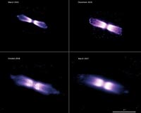 Paris, France (SPX) Nov 19, 2009 Using ESO's Very Large Telescope and its ability to obtain images as sharp as if taken from space, astronomers have made the first time-lapse movie of a rather unusual shell ejected by a "vampire star", which in November 2000 underwent an outburst after gulping down part of its companion's matter. This enabled astronomers to determine the distance and intrinsic brightness of the outbursting object. It appears that this double star system is a prime candidate to be one of the long-sought progenitors of the exploding stars known as Type Ia supernovae, critical for studies of dark energy. "One of the major problems in modern astrophysics is the fact that we still do not know exactly what kinds of stellar system explode as a Type Ia supernova," says Patrick Woudt, from the University of Cape Town and lead author of the paper reporting the results. "As these supernovae play a crucial role in showing that the Universe's expansion is currently accelerating, pushed by a mysterious dark energy, it is rather embarrassing." The astronomers studied the object known as V445 in the constellation of Puppis ("the Stern") in great detail. V445 Puppis is the first, and so far only, nova showing no evidence at all for hydrogen. It provides the first evidence for an outburst on the surface of a white dwarf dominated by helium. "This is critical, as we know that Type Ia supernovae lack hydrogen," says co-author Danny Steeghs, from the University of Warwick, UK, "and the companion star in V445 Pup fits this nicely by also lacking hydrogen, instead dumping mainly helium gas onto the white dwarf." In November 2000, this system underwent a nova outburst, becoming 250 times brighter than before and ejecting a large quantity of matter into space. The team of astronomers used the NACO adaptive optics instrument on ESO's Very Large Telescope (VLT) to obtain very sharp images of V445 Puppis over a time span of two years. The images show a bipolar shell, initially with a very narrow waist, with lobes on each side. Two knots are also seen at both the extreme ends of the shell, which appear to move at about 30 million kilometres per hour. The shell - unlike any previously observed for a nova - is itself moving at about 24 million kilometres per hour. A thick disc of dust, which must have been produced during the last outburst, obscures the two central stars. "The incredible detail that we can see on such small scales - about hundred milliarcseconds, which is the apparent size of a one euro coin seen from about forty kilometres - is only possible thanks to the adaptive optics technology available on large ground-based telescopes such as ESO's VLT," says Steeghs. A supernova is one way that a star can end its life, exploding in a display of grandiose fireworks. One family of supernovae, called Type Ia supernovae, are of particular interest in cosmology as they can be used as "standard candles" to measure distances in the Universe and so can be used to calibrate the accelerating expansion that is driven by dark energy. One defining characteristic of Type Ia supernovae is the lack of hydrogen in their spectrum. Yet hydrogen is the most common chemical element in the Universe. Such supernovae most likely arise in systems composed of two stars, one of them being the end product of the life of sun-like stars, or white dwarfs. When such white dwarfs, acting as stellar vampires that suck matter from their companion, become heavier than a given limit, they become unstable and explode. The build-up is not a simple process. As the white dwarf cannibalises its prey, matter accumulates on its surface. If this layer becomes too dense, it becomes unstable and erupts as a nova. These controlled, mini-explosions eject part of the accumulated matter back into space. The crucial question is thus to know whether the white dwarf can manage to gain weight despite the outburst, that is, if some of the matter taken from the companion stays on the white dwarf, so that it will eventually become heavy enough to explode as a supernova. Combining the NACO images with data obtained with several other telescopes the astronomers could determine the distance of the system - about 25 000 light-years from the Sun - and its intrinsic brightness - over 10 000 times brighter than the Sun. This implies that the vampire white dwarf in this system has a high mass that is near its fatal limit and is still simultaneously being fed by its companion at a high rate. "Whether V445 Puppis will eventually explode as a supernova, or if the current nova outburst has pre-empted that pathway by ejecting too much matter back into space is still unclear," says Woudt. "But we have here a pretty good suspect for a future Type Ia supernova!" Share This Article With Planet Earth