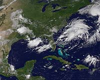 Greenbelt MD (SPX) Aug 01, 2007 The third tropical depression of the Atlantic hurricane season formed around 11:00 p.m. EDT on Monday, July 30 west of Bermuda. Exactly 12 hours later on Tuesday, July 31, at 11:00 a.m. EDT, the storm strengthened into a tropical storm with sustained winds of 40 mph and higher gusts. At that time, the storm was named Tropical Storm Chantal. Chantal was located near latitude 40.2 north and longitude 62.7 west, about 330 miles (530 km) south of Halifax, Nova Scotia and is moving rapidly toward the northeast near 23 mph (37 km/hr). Chantal is not a threat to the United States. Estimated minimum central pressure is 999 millibars, down from 1007 millibars just five hours before on July 31. A drop in pressure is a sign of strengthening. Chantal is the cluster of clouds off the U.S. east coast in the top right side of this satellite image. This image was created with data from the Geostationary Operational Environmental Satellite (GOES-12), on July 31 at 14:30 UTC (10:30 a.m. EDT). GOES-12 is operated by the National Oceanic and Atmospheric Administration. This image was created by NASA's GOES Project Science Office at NASA's Goddard Space Flight Center, Greenbelt, Md.