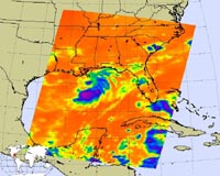 Pasadena CA (SPX) Aug 05, 2008 Fed by the warm waters of the Gulf of Mexico, Tropical Storm Edouard gathers strength in the northern Gulf of Mexico, as seen in this thermal infrared imaged taken at 7:35 UTC (3:35 a.m. EDT) August 4 from the Atmospheric Infrared Sounder instrument on NASA's Aqua spacecraft. At 2 p.m. EDT, Edouard had maximum sustained winds near 45 miles per hour (75 kilometers per hour) and was located 145 miles (230 kilometers) south-southeast of Lafayette, La. and 240 miles (390 kilometers) east-southeast of Galveston, Texas, moviing toward the west-northwest near 8 miles per hour (13 kilometers per hour). Forecasters expect Edouard to be near hurricane strength when it makes landfall some time Tuesday morning along the upper Texas coast or southwestern Louisiana coast. Edouard is expected to bring with it a storm surge of two to four feet about normal tide levels and rain accumulations of three to five inches in some Louisiana coastal counties and southeast Texas, with isolated maximum amounts of up to 10 inches possible over southeastern Texas. The AIRS image shows the temperature of the cloud tops or the surface of Earth in cloud-free regions. The lowest temperatures (in purple) are associated with high, cold cloud tops that make up the top of Tropical Storm Edouard. The AIRS data creates an accurate 3-D map of atmospheric temperature, water vapor and clouds, all of which are helpful to forecasters. The infrared signal of the AIRS instrument does not penetrate through clouds. Where there are no clouds, AIRS reads the infrared signal from the surface of the ocean waters, revealing warmer temperatures in orange and red.