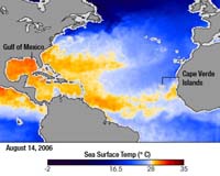 Greenbelt MD (SPX) Oct 01, 2007The fourteenth tropical depression of the Atlantic Ocean hurricane season formed in the far eastern Atlantic Ocean on Friday, Sept. 28, bringing three active storms in the Atlantic in one week. Hurricane Lorenzo just made landfall in eastern Mexico, and tropical depression Karen is fizzling in the central Atlantic. At 11:00 a.m. EDT on Sept. 28, Tropical Depression #14 (TD#14) was located near 14.1 degrees north latitude and 26.5 degrees west longitude, or about 210 miles southwest of Africa's Cape Verde Islands. |