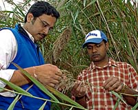 Newark DL (SPX) Oct 16, 2007 Scientists at the University of Delaware have uncovered a hidden weapon that one of the most invasive wetland plants in the United States uses to silently and efficiently "bump off" its neighbors. The invasive strain of Phragmites australis, or common reed, believed to have originated in Eurasia, exudes from its roots an acid so toxic that the substance literally disintegrates the structural protein in the roots of neighboring plants, thus toppling the competition. "Phragmites is taking over the marsh world," said UD plant biologist Harsh Bais. "It's a horticultural disaster." In Delaware alone, the tall, tasseled grass has overtaken tens of thousands of acres of wetlands, decreasing biodiversity, reducing the food and habitat available to wildlife, and altering wetland hydrology, transforming marshes once dissected by tidal creeks and open pools into much drier systems with dense monocultures of the plant. Bais, who led the project, is an assistant professor of plant and soil sciences in UD's College of Agriculture and Natural Resources and holds an appointment at the Delaware Biotechnology Institute. His collaborators included postdoctoral researcher Thimmaraju Rudrappa, undergraduate student Justin Bonstall, and marine botanists John Gallagher and Denise Seliskar, who co-direct the Halophyte Biotechnology Center in UD's College of Marine and Earth Studies. The results of the research are reported in the latest issue of the Journal of Chemical Ecology. Bais is an expert on allelopathy, in which one plant produces a chemical to inhibit the growth of another plant. He refers to these plants with the capability to wage chemical warfare as "natural killers." Walnut trees, pine trees, ferns and sunflowers are among the plants that release harmful chemicals to prevent other plants from growing too close to them. However, Phragmites uses this strategy not so much to keep other plants away, but to aggressively conquer them and invade new territory. "We've seen this capability in a number of invasive plants that have come from Eurasia, such as garlic mustard," Bais said. "The roots exude a toxin that kills native plants." In laboratory analyses at the Delaware Biotechnology Institute, Rudrappa and Bais used activated charcoal, the material in aquarium filters, to sequester secretions from both invasive and native Phragmites plants. The charcoal attracts and traps organic chemicals. The scientists identified the toxin produced by Phragmites as 3,4,5-trihydroxybenzoic acid. Also known as gallic acid, it is used for tanning leather, to formulating astringents. "It's nasty stuff," Bais said. "If you get some of it on your skin, you definitely know it." The toxin works, Bais said, by targeting tubulin, the structural protein that helps plant roots to maintain their cellular integrity and grow straight in the soil. Within 10 minutes of exposure to the toxin in the lab, the tubulin of a marsh plant under siege starts to disintegrate. Within 20 minutes, the structural material is completely gone. "When the roots collapse from the acid, the plant loses its integrity and dies," Bais noted. "It's like having a building with no foundation--it's on its way to self-destruction." The native Phragmites also secretes the toxin, but the exotic strain releases much higher concentrations, which could be a key to its dominance, Bais said. Today in Delaware, stands of native Phragmites are few and far between. Bais credits Gallagher and Seliskar, who have conducted extensive research on the plant, for growing sterile cultures of the native and exotic strains for his lab tests. "This research reveals another weapon in the arsenal that Phragmites uses to overtake marshland," Seliskar said. "Screening large numbers of marsh plants to identify those that are naturally resistant to invasive Phragmites may be one avenue for preserving the native strain, as well as controlling the invasive's spread," Bais noted. With the current discovery in hand, Bais said he hopes to pursue further research to pinpoint exactly how the invasive Phragmites has become such a "super weed." Such information could help scientists and environmental managers gain a foothold in halting Phragmites' rapid advance across the United States. "We now know this plant secretes a toxin underground, but could it have a partner in crime?" Bais asks. "Could there be some kind of microbe, a deleterious pathogen, that is associated with this plant? And does this plant use changing environmental systems to its advantage? We just don't know the answers yet, but we'd like to find out." Community Email This Article Comment On This Article Related Links Darwin Today At TerraDaily.com