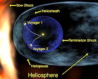 Iowa City IO (SPX) Jul 03, 2008 Two University of Iowa space physicists report that the Voyager 2 spacecraft, which has been traveling outward from the Sun for 31 years, has made the first direct observations of the solar wind termination shock, according to a paper published in the July 3 issue of the journal Nature. At the termination shock the solar wind, which continuously expands outward from the sun at over a million miles per hour, is abruptly slowed to a subsonic speed by the interstellar gas. Don Gurnett, professor of physics in the College of Liberal Arts and Sciences and principal investigator for the plasma wave instrument on Voyager 2, and Bill Kurth, UI research scientist and Voyager co-investigator, said that the shock crossing was marked by an intense burst of plasma wave turbulence detected by the UI instrument, as well as by various effects detected by other instruments on the spacecraft. At the time of the shock crossing, August 31, 2007, Voyager 2 was at a distance of 83.7 astronomical units (AU), roughly twice the distance between the Sun and Pluto. At this great distance, it took 11.2 hours for the radio signal from the spacecraft to reach Earth. Shock waves in the thin, ionized gas -- called plasma -- that exists in space are similar in some respects to the shock waves produced by an airplane in supersonic flight. Shock waves in space are believed to play an important role in the acceleration of cosmic rays, which are very energetic atomic particles that continually bombard Earth. The most energetic cosmic rays, which are potentially hazardous to astronauts, are believed to be produced in intense shock waves caused by supernova explosions -- immense stellar explosions that occur in massive stars toward the end of their lives. The termination shock is believed to be responsible for the origin of less energetic cosmic rays called "anomalous cosmic rays." The recent observations at the termination shock are expected to help physicists understand how cosmic rays are produced by the turbulent fields that exist in such shocks. Gurnett said,"There is no way for us to make direct measure of a super nova shock, so the Voyager 2 measurements at the termination shock provide us the best opportunity in the foreseeable future to understand how cosmic rays are produced by supernova cosmic shocks." Kurth noted that while some aspects of the termination shock matched scientists expectations, a number of the observations made by Voyager were surprising and will cause a number of theories to be revised. Gurnett noted that Voyager 2, launched in 1977, is moving at a speed of 38,000 miles an hour. Even at this considerable speed, the spacecraft will still take 30,000 years to reach a distance equal to that of the nearest star. Community Email This Article Comment On This Article Related Links Sounds of Voyager's encounter with shock waves Solar Science News at SpaceDaily