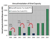 Washington DC (SPX) May 14, 2008 With the fate of a key federal incentive in the balance, the U.S. wind energy industry continued new installations at a breakneck pace in the first quarter of 2008, putting 1,400 megawatts (MW) or approximately $3 billion worth of new generating capacity in place, the American Wind Energy Association (AWEA) said in it's quarterly market report. "These new wind power plants-enough to serve the equivalent of 400,000 homes--coupled with investment in 17 new manufacturing facilities over the past year and a quarter show that - with consistent policy support - America's wind industry can deliver the goods in terms of clean energy and new clean technology jobs," commented AWEA Executive Director Randall Swisher. "But if Congress does not act quickly, this momentum could be derailed at the worst possible time for the economy, placing 76,000 jobs and over $11.5 billion in investment at risk," Swisher added. "While 2008 is shaping up to be another great year, we could see a very different story in 2009 as uncertainty looms over investment in wind power projects and manufacturing due to continuing delay in extending the production tax credit (PTC)," Swisher added. The PTC is the primary federal incentive for wind power, and expires at the end of the year along with incentives for other renewable electricity sources. The new wind power facilities installed this quarter span 10 states and bring total U.S. wind power capacity to over 18,000 MW, or enough to serve the equivalent of 5 million homes. Texas added over half this new capacity and now has well over 5,000 MW installed. Over 4,000 MW of projects are now also under construction nationwide. Additionally, AWEA reports an increase in the share of U.S.-made wind turbine components-from less than 30% to approximately 50% in three years. Prior to 2005, AWEA estimates that less than a third of components were manufactured domestically. But the relatively stable availability of the PTC since August 2005 has allowed U.S.-based supply chain providers to begin establishing a much stronger foundation of domestic manufacturing for turbine components, which range from towers and blades to gearboxes, bearings, and electrical and electronic components. AWEA estimates that, by the end of 2008, approximately half of turbine components for turbines installed in the U.S. will be produced domestically. In 2007 and early 2008, at least 17 manufacturing facilities have been brought online or expanded in the U.S., creating over 4,000 jobs and $500 million in manufacturing investment. Adjustment to final numbers for megawatts of wind power installed in the U.S. in 2007 show a slight increase to 5,249 MW, up from the 5,244 MW announced in January. Since actual installed capacity for natural gas was less than expected in 2007, new wind power facilities in fact made up close to 35% of the entire new power generating capacity added in the U.S. last year, up from the 30% initially reported in January. In June, the WINDPOWER 2008 Conference and Exhibition will open in Houston, in the heart of the energy capital of Texas, now the state with the largest wind power market in the nation. WINDPOWER 2008 will be the U.S.'s biggest wind industry show ever, with over 8,000 attendees and 700 exhibitors, including leading global wind turbine manufacturers and many component and supply chain providers. Community Email This Article Comment On This Article Related Links AWEA First Quarter 2008 Market Report Powering The World in the 21st Century at Energy-Daily.com