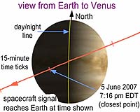 Geometry and timing of closest approach At this time, Venus Express will be behind Venus, but it will look at the same regions observed by MESSENGER before and after the fly-by. This will allow the scientists to compare data of the same areas obtained by the two spacecraft within only a short difference in time from each other.