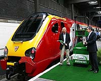 London (AFP) Jun 07, 2007 Europe's first train powered by bio-diesel went into service here Thursday with Britain's next prime minister Gordon Brown on board for its maiden journey. Finance minister Brown travelled on the Virgin Voyager train which left London Euston station for Llandudno on the north Wales coast. The train has been modified to run on a blended fuel which is 20 percent environmentally-friendly bio-diesel -- fuel derived from sustainable and biological sources such as rapeseed, soyabean and palm oil -- and produces less carbon dioxide emissions than diesel. Virgin Trains hopes to convert its entire fleet to run on bio-diesel if a six-month trial proves successful. Virgin chairman Sir Richard Branson believes the move could slash its carbon dioxide emissions by 14 percent -- which the rail operator believes is the equivalent of taking 23,000 cars off the road. "It's fantastic that we are leading the rest of Europe in developing this fuel," the tycoon told reporters. Chancellor of the Exchequer Brown, who will take over as prime minister when Tony Blair steps down on June 27, told reporters he was delighted that bio-diesel was being used. "I want Britain to be a world leader in the development and use of environmentally-friendly fuels and I believe they will play a fundamental part in our efforts to reduce emissions and tackle climate change," he said. "If this scheme works well we are prepared to look at other things. We are prepared to look at what could be done in the future. "We have to prove that this works. If it works I want other train companies to consider using bio-diesel." The train will travel on Virgin routes across Britain during the six-month experiment. In Brown's last budget, he announced that the rate of duty paid on the kind of fuels used in the Virgin Trains pilot would be "permanently reduced" -- from 54.68 pence to 7.69 pence a litre (1.08 dollars, to 15 cents, 80 euro cent to 11 euro cent). "The government will take the results of this pilot into account alongside other factors when taking future decision about duty levels," a Treasury spokesman said.