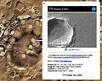 for Astrobiology Magazine Moffett Field CA (SPX) Mar 27, 2009 Did you ever wish you could stroll through the caldera of Olympus Mons, the largest volcano in the solar system? Study the rock formations in Valles Marineris, a martian canyon as wide as the United States? Or retrace the tracks of NASA's Spirit and Opportunity rovers? Then you'll want to check out Google Mars. Tucked away inside the recently released Google Earth 5.0, Google Mars is the impressive product of a three-year collaboration between Google and the Intelligent Robotics Group at NASA Ames Research Center. First things first: You can download Google Earth 5.0 at earth.google.com. After you launch the program, find the icon in the toolbar at the top that looks like Saturn. Click it and select Mars from the pull-down menu. Welcome to the Red Planet! Google Mars uses the same technology as Google Earth, but the imagery comes from various NASA and ESA orbital satellites, dating as far back as the Viking orbiters in the 1970s, and including images taken as recently as within the past year by NASA's Mars Odyssey and Mars Reconnaissance Orbiter, and ESA's Mars Express, all three of which are still in operation. Although captured at different resolutions and under different lighting conditions, these various images are stitched together seamlessly to provide a wonderful immersive experience. Well, almost seamlessly - you do encounter the occasional bizarre artifact. Like Google Earth, Google Mars lets you explore Mars in 3-D. It's like an atlas and a flight simulator combined into one. You can, of course, zoom in and out to see varying amounts of detail. But you can also shift perspective. For example, if you want to check out Valles Marineris, you can wander along the canyon rim, looking down, or shift your viewpoint to the valley floor and gaze up at the canyon walls. (A useful hint: holding down the Shift key while you drag your mouse around is the simplest way to shift perspective.) Not all of the highest-resolution data loads automatically. Colored squares, each color representing images captured by a particular orbital camera, appear where more-detailed views are available. Clicking an icon pops up a window that describes the image, and offers a link to a Web page containing additional information. Some images can be loaded directly into Google Mars, overlaying the existing imagery. Note, however, that although the global map of Mars appears in full color, the highest-resolution images are black-and-white. One of the primary motivations for developing Google Mars was to provide scientists with an easy way to access Mars images. All of the image data in Google Mars are publicly available elsewhere online. But, says Matt Hancher, one of the NASA members of the team that developed Google Mars, "the interfaces for searching for these images through the Planetary Data System, the PDS, right now are quite clunky. If you know exactly what you're looking for, then it's possible to find it, it's all there, it's public. But it's a painful process." With Google Mars, Hancher says, "the scientists can go directly from browsing the planet" to finding all of the image data available for a specific location. With Google Mars, "you can see what's available without having to search in five different indexes." For example, you can display the paths followed by NASA's Mars Exploration Rovers, Spirit and Opportunity, including the rovers' waypoints, locations where they stopped to collect scientific data. Clicking a waypoint opens a window containing Web links to the data. But Google Mars isn't intended to be used only by scientists. The regions over which the MER rovers have traveled also contain some of the most stunning imagery Google Mars has to offer. When you zoom in on the terrain traversed by Spirit or Opportunity, camera icons appear; clicking one of these icons lets you "fly" into a panorama captured by the rover's PanCam, a high-resolution camera. It's easy to lose an hour or two navigating within these panoramas, zooming in to see details as all as individual rocks and boulders, then back out to admire the scenic vista. Check out, for example, the view of Cape Verde, a rock outcrop, taken from the rim of Victoria Crater by the PanCam on Opportunity. In addition to imagery, Google Mars includes extensive material from William K. Hartmann's popular-science book, "A Traveler's Guide to Mars." Each book excerpt - they appear at various places on the planet that are of particular historic or scientific interest - is marked by a green icon of two hikers. The challenge facing Google Mars's creators, now that the software has been released, is how to keep it up-to-date. Although a great deal of image data has already been linked in to the program, Google Earth (and by extension Google Mars) is really a browser, not a repository of data. Each included image had to undergo extensive processing to transform the raw image data sent back by a NASA or ESA spacecraft into a usable format. But new images are being sent back from Mars daily, and this most-recent imagery is not currently accessible through Google Mars. "We're working now to understand how to set up those processes, so the most recent publicly released imagery of Mars will always be available," says Hancher. "That's what going to make a useful tool to scientists, and that what's going to make it fun and interesting for the public." In the meantime, if you're looking for someplace inexpensive to go on your next vacation, consider Mars. With the release of Google Earth 5.0, it's easier than ever before to check out the best sights the Red Planet has to offer. Share This Article With Planet Earth