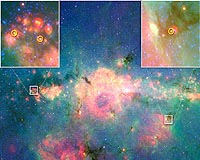Baby Stars Finally Found In Jumbled Galactic CenterPasadena CA (SPX) Jun 11, 2009 Astronomers have at last uncovered newborn stars at the frenzied center of our Milky Way galaxy. The discovery was made using the infrared vision of NASA's Spitzer Space Telescope. The heart of our spiral galaxy is cluttered with stars, dust, and gas, and at its very center, a supermassive black hole. Conditions there are harsh, with fierce stellar winds, powerful shock waves, and other ... read more |